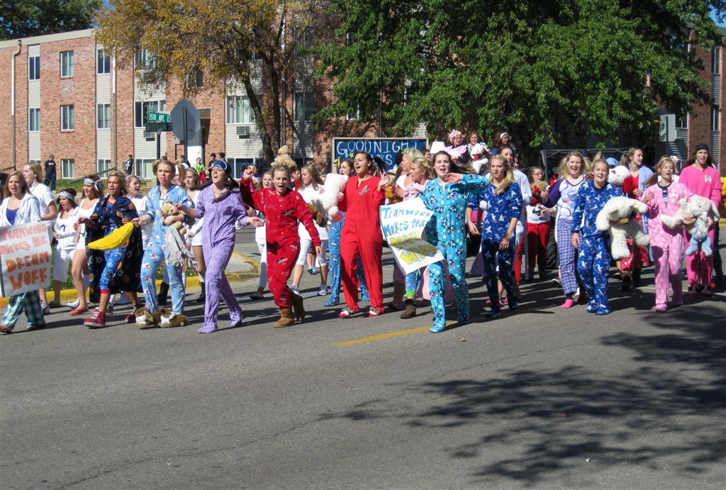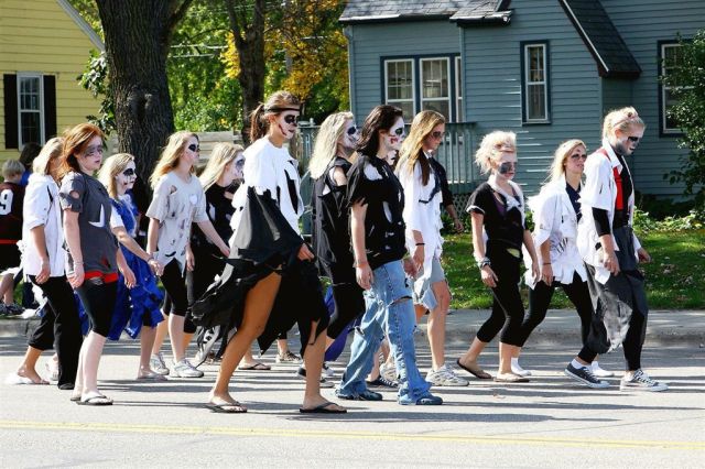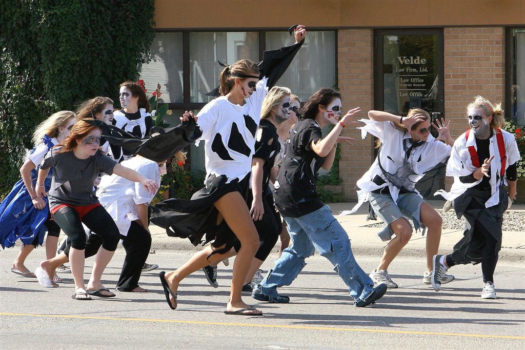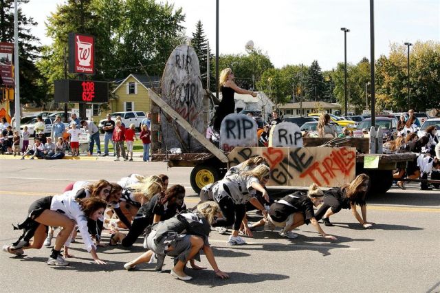 The still photos (by Greg Trumm) are of the volleyball team during the 2008 homecoming parade. The volleyball had its 42-game conference win streak snapped last night by a fine and undefeated Rocori team, 3 – 1. The 4th game went into overtime . . . or extra innings . . . or whatever they call it in volleyball. I was only able to stay for the 1st two games because it was Thursday night date night at SAWA, and we wanted to see Al and Erik play.