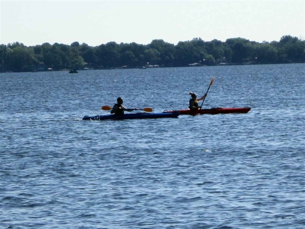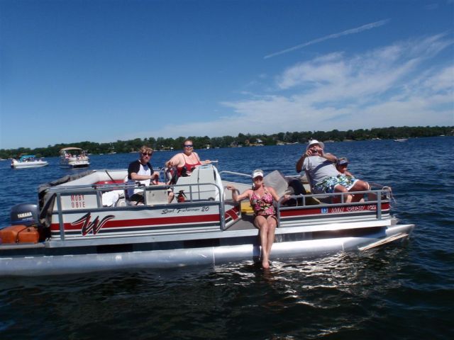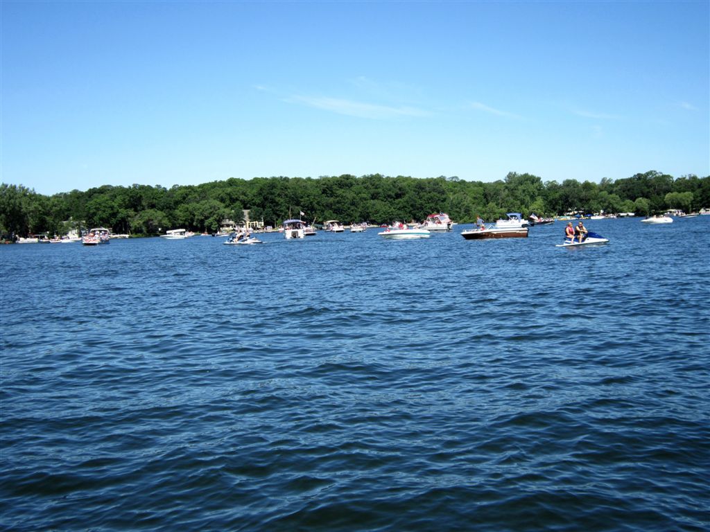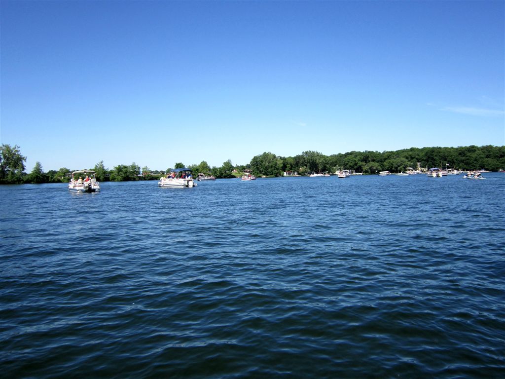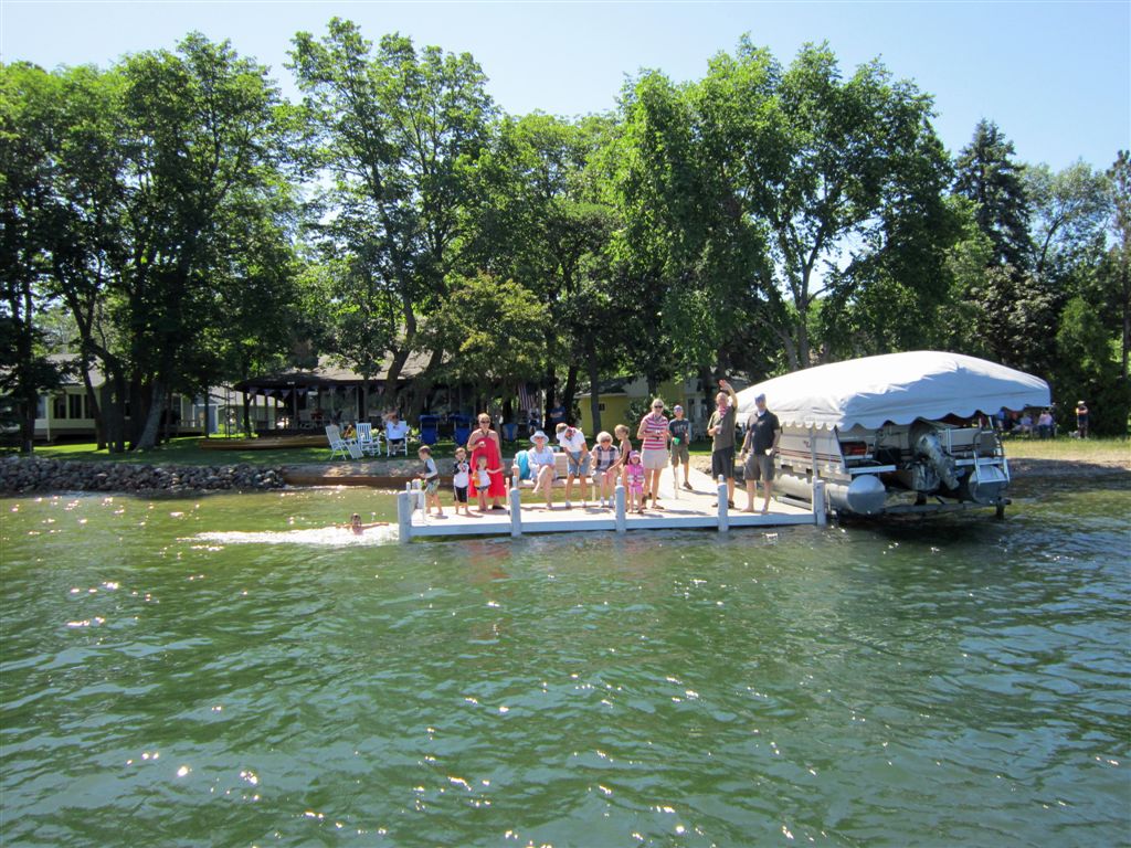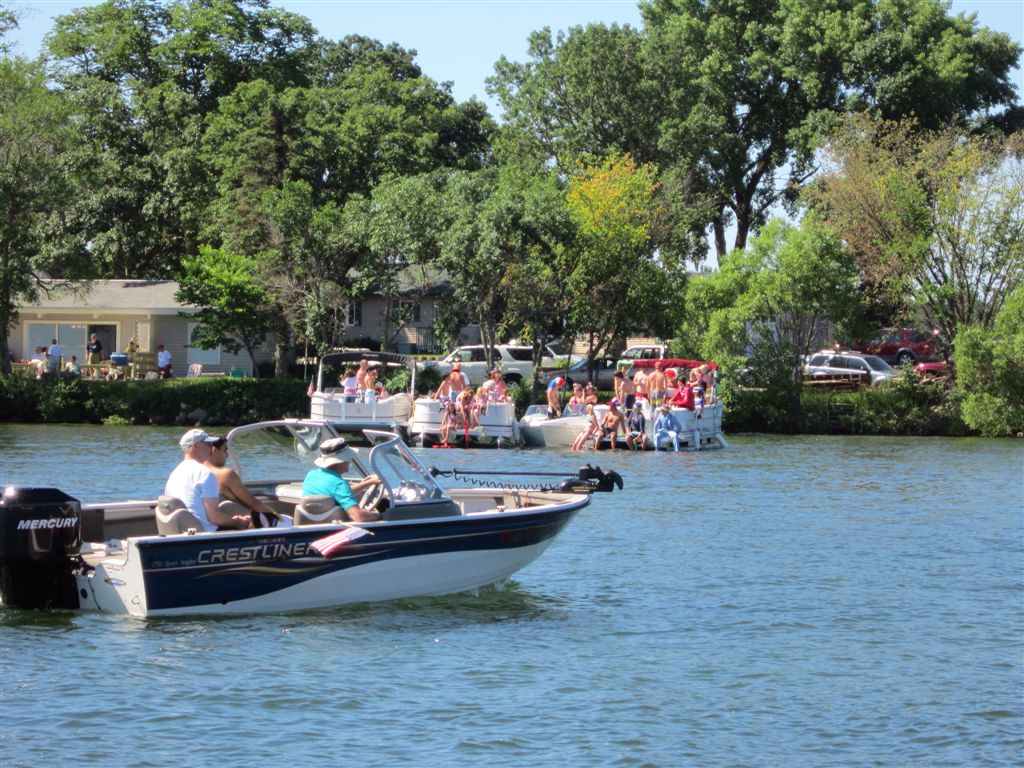 [Above: Neighbor “Dangerous” Dan’s family prepping their boat; kayakers were everywhere over the weekend; family traversing down to the Moby; neighbor Jo & Arnie’s pontoon ready; Tom cooling it till he takes the con; the channel from the Lake Carlos side.]