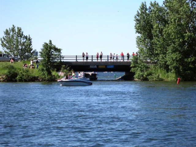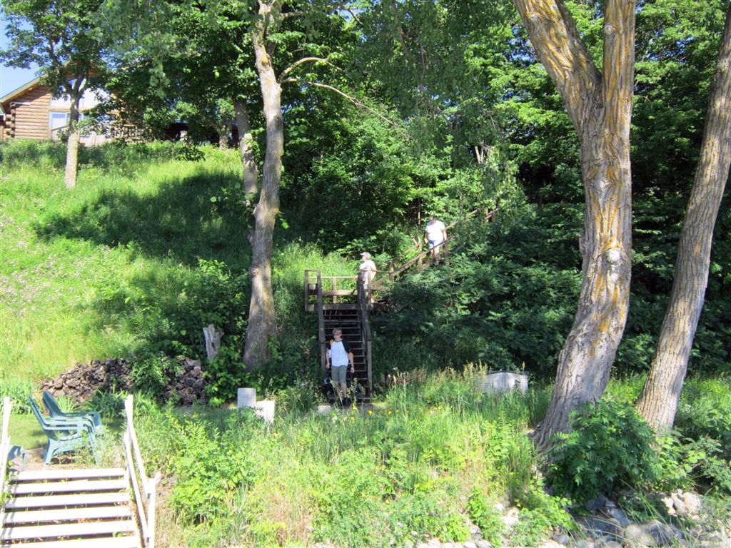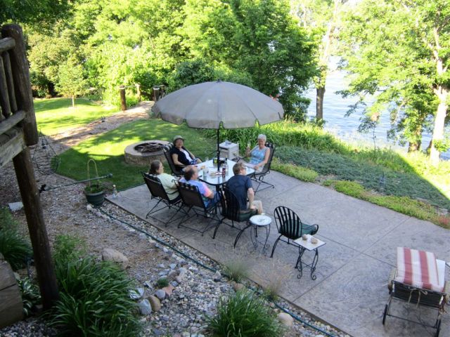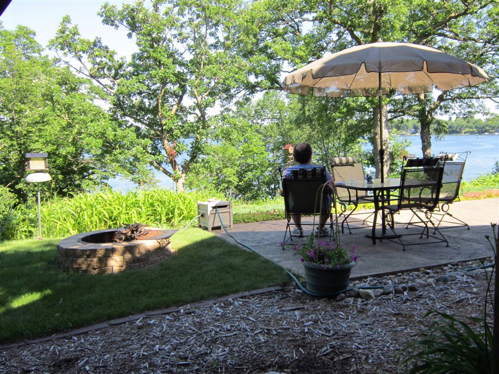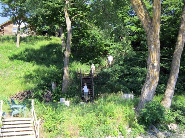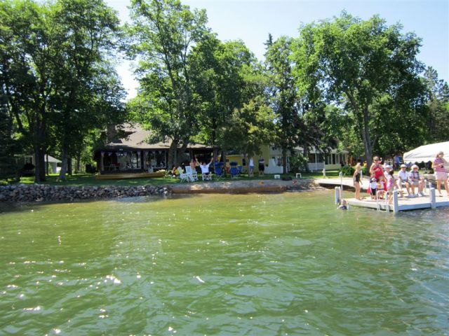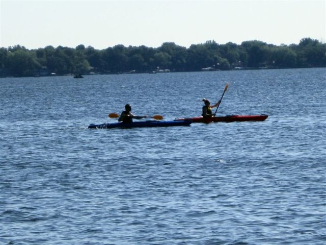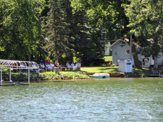 [Above: Neighbor “Dangerous” Dan’s family prepping their boat; kayakers were everywhere over the weekend; family traversing down to the Moby; neighbor Jo & Arnie’s pontoon ready; Tom cooling it till he takes the con; the channel from the Lake Carlos side.]