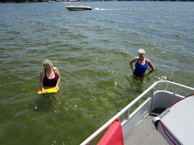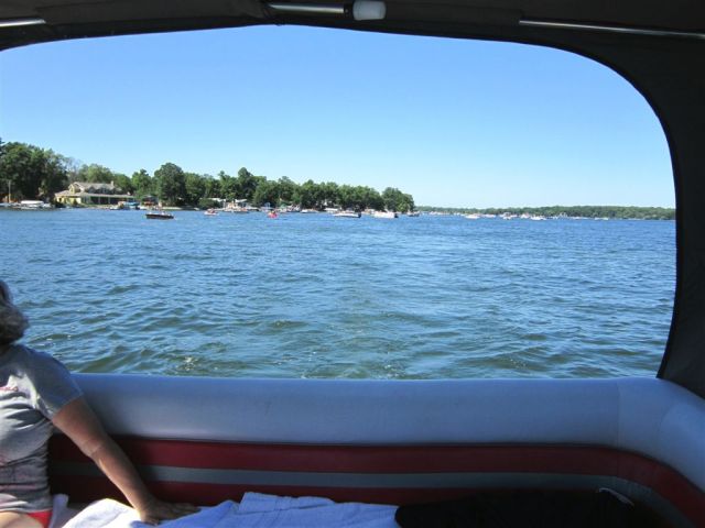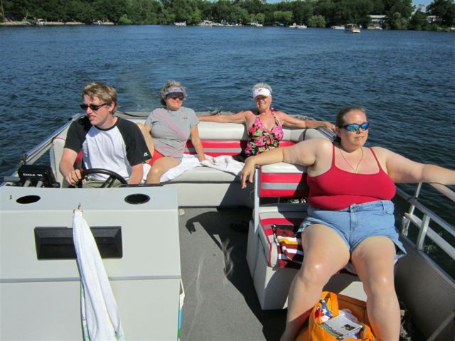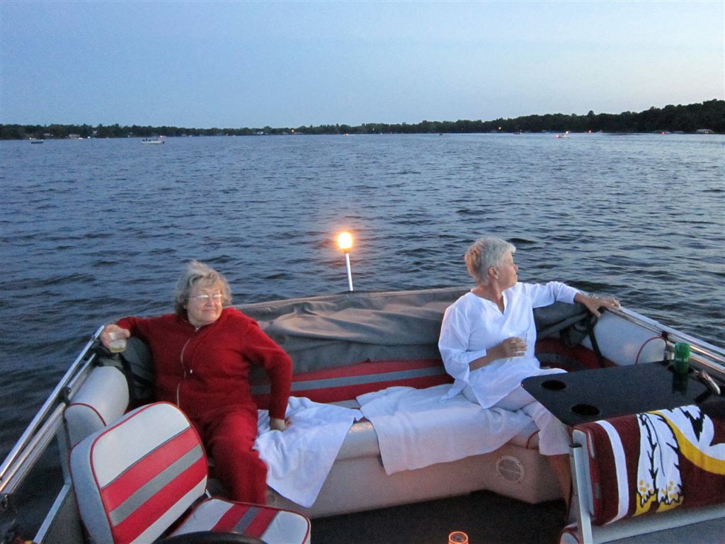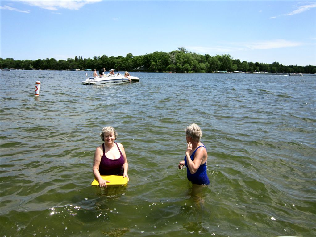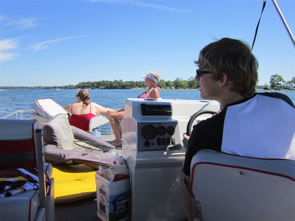 [The grandson piloted us around beautiful Lake Darling. The Biddies went for a swim – and both subsequently got a smidgeon of lake itch.]