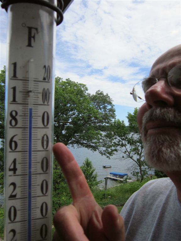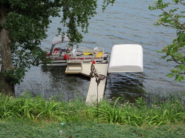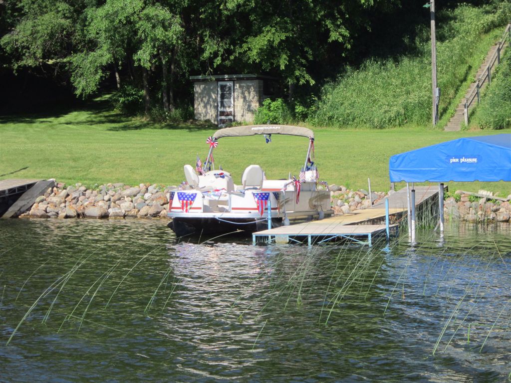 Upon return from Lake Carlos, the Moby was parked thusly because – it is now time for another episode of . . . Mr. Maintenance! The light at the top of the canopy had broken loose from its moorings a couple years ago – again, another design flaw that was expected to stay attached with metal screws only (rather than bolts and nuts). By leaving the Moby at the end of the dock, handyman son-in-law and grandson could get at it for the fix prior to going out for the fireworks at night. The local constabulary frowns upon the idea of being out on the lake at night without such light prominently displayed and lit! Well, the Moby sat there all afternoon bouncing in the waves and wakes. When we went down at dusk, such lurching had pulled the dock post loose from the dock – it was dangling in the water attached to the mooring line. Rather than trying to figure it out in the relative darkness, we just laid the post on the dock behind the bench and went out to enjoy the fireworks. We when got back it was dark, of course, and when I stepped out of the Moby onto the dock I accidentally kicked the unseen dock post into the water. The supervisor spent a restless night worrying about the dock post.