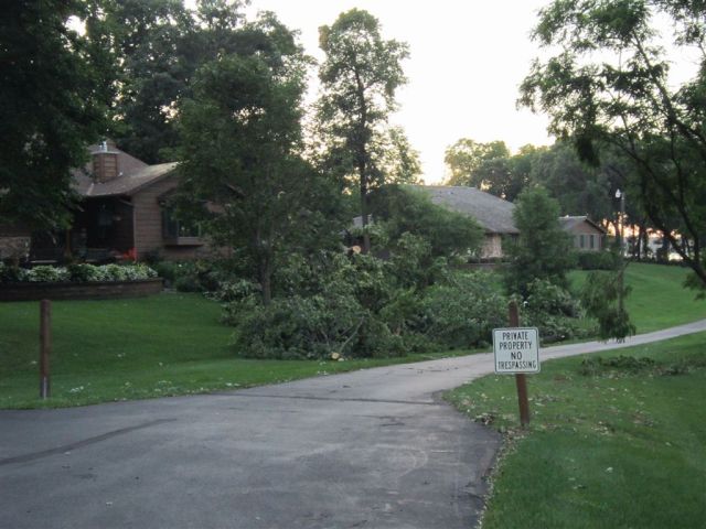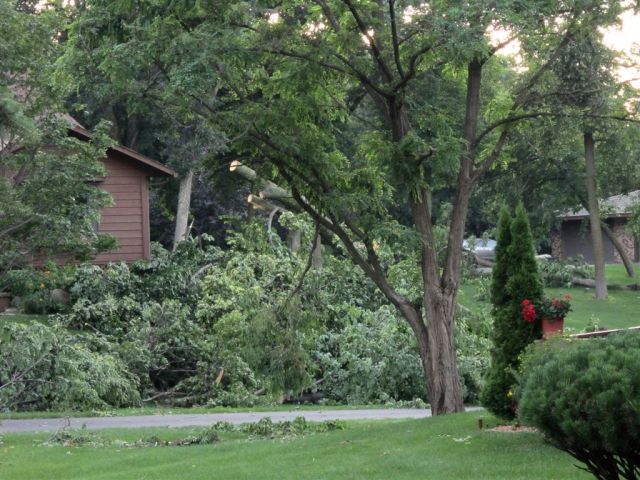 And there have been weather things going on beyond the scope of deluge. We have had dew points – dew points like the state has never seen before. As you may recall from your weather lessons from your favorite TV meteorologist, if you have dew points in the 50’s, it’s comfortable; dew points in the 60’s means it’s humid; dew points in the 70’s means it’s tropical; dew points in the 80’s mean head to the meat lockers! Minnesota averages about 2 ½ days a year with dew points in the 70’s. In this glorious month of July, dew points in the 80’s have been setting records throughout the state. I have moss growing on my north side! And since dew points in the 80’s are not normal, abnormal weather, i.e., storms seem to follow. The neighbors lost a few trees at Mom’s, and we didn’t notice until this week that the tree in front Mom’s was “topped” by that same storm: