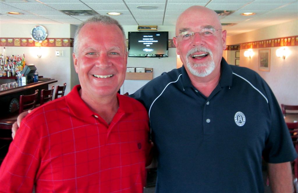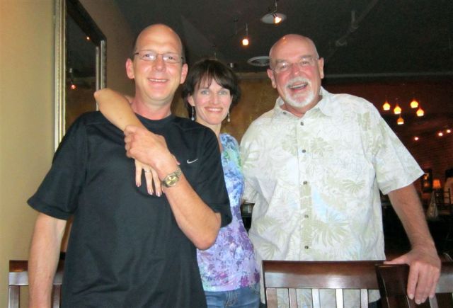 We also had a mini old home week in Alex. Brother Cam came up from Mounds View with his old buddy from Arlington, Virginia, Rog “Travelin’ Man” Tweed – both posed with the supervisor at dusk on the shores of beautiful Lake Le Homme Dieu. While they were here, we ate, and ate, and ate some more, including a mini reunion at Weston Station of ex-Victoria Heighters – members of the Dyke and Thompson families. Perry Dyke joined me for a round of golf at the AGC. Perry played for our Cardinal golf team going to state all four years, 1968-71, and fired a nifty 76 on his old home course where he hadn’t played for 15 years. He has been a TV sports anchor in Mankato for 30 years, covering the Vikings in training camp, and will be inducted into the Minnesota State University, Mankato, for his years of coverage thereof. We also discovered Alex has made the move to borderline urbandom – a Thai restaurant his mysteriously appeared in town (in the old Butler’s Pantry building in Willow Creek). We have yet to dine there though – but we discovered a real deal (?) on pizza!