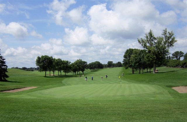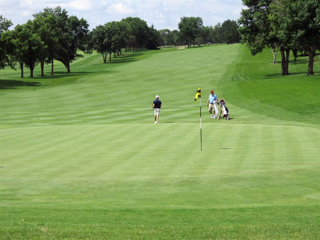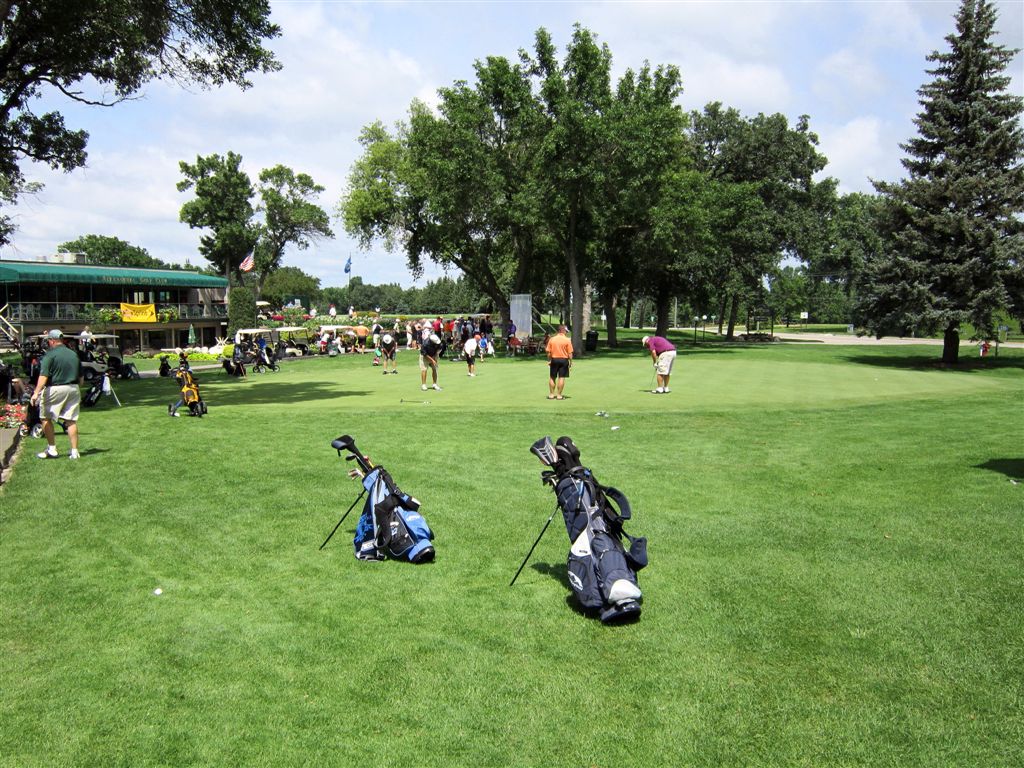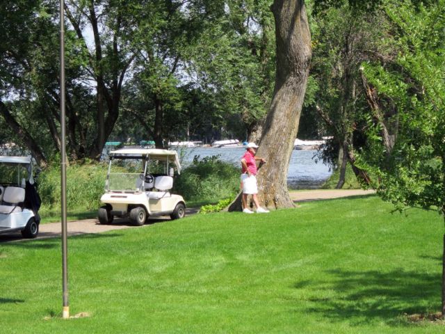 [Following the Resorters yesterday, we arrived at the signature 7th hole – Lake Darling is overtaking the golf course. You can see the left sandtrap is totally filled with water – a ground rule for the tournament yesterday was a free drop out of all sand traps.]