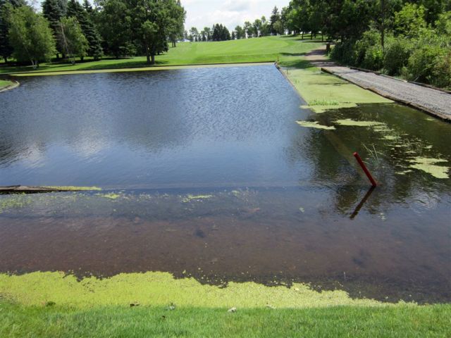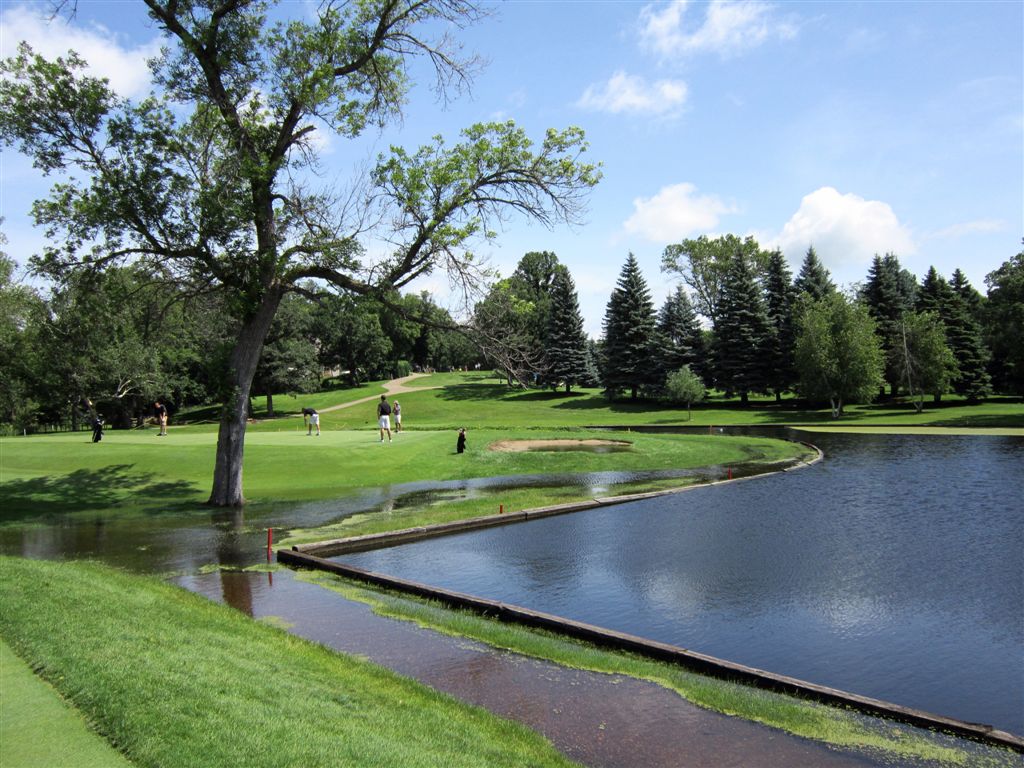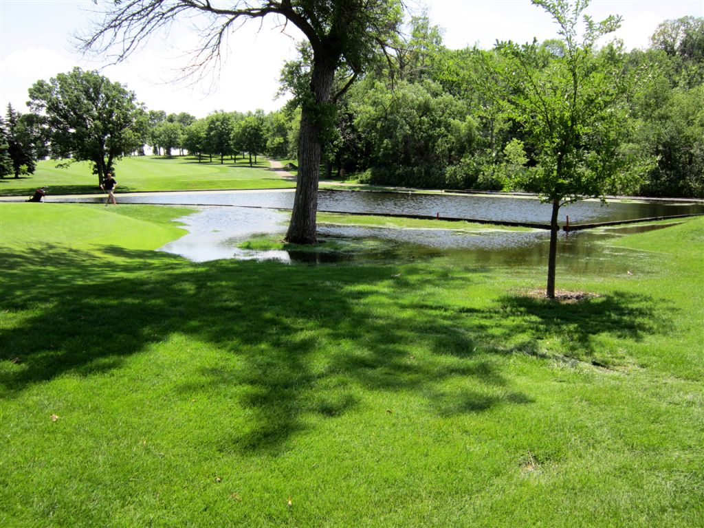[Water is coming over the top of the water hazard retaining walls. Those walls were caving in anyway, and along with the need to upgrade the green the entire hole will be reconstructed as soon as the tournament is over. It will be playable again next June – water will no longer be in front of the green or the 8th tee box.]