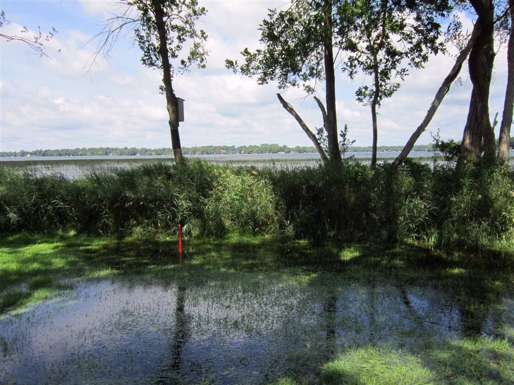 [Telephoto shot from the 8th tee across the lake to the point between Big and Little Darling. The homeowners there had FIVE dump truck loads of sand delivered this week to build berms around their houses.]