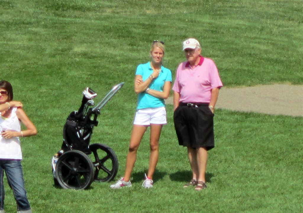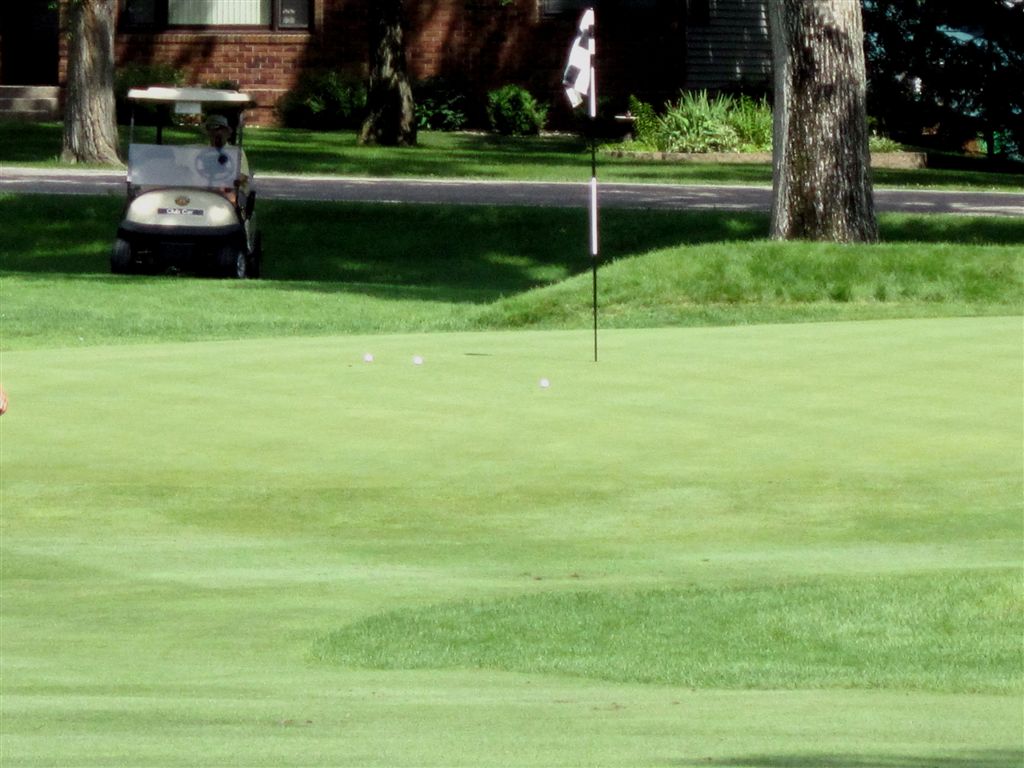 [Barb and Roger Riley follow Maggie’s tee shot on No. 7 – about 6 feet left of the pin. Emily knocked hers stiff. Two birdies.]