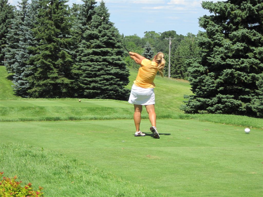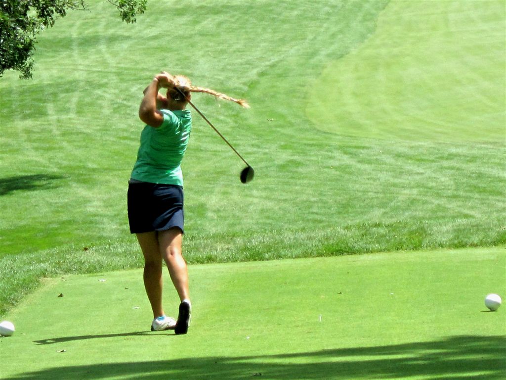 [Editor’s note: Destined to become a favorite photo, if I do say so myself, I captured Maggie Leland’s classic power swing teeing off on No. 3 during her semi-final match. Senior men golfers have concluded that attempting to duplicate Maggie’s swing in terms of ease, balance, flexibility, and swing speed would result in us toppling off the side of the tee box and ending up in traction for about a month and a half.]