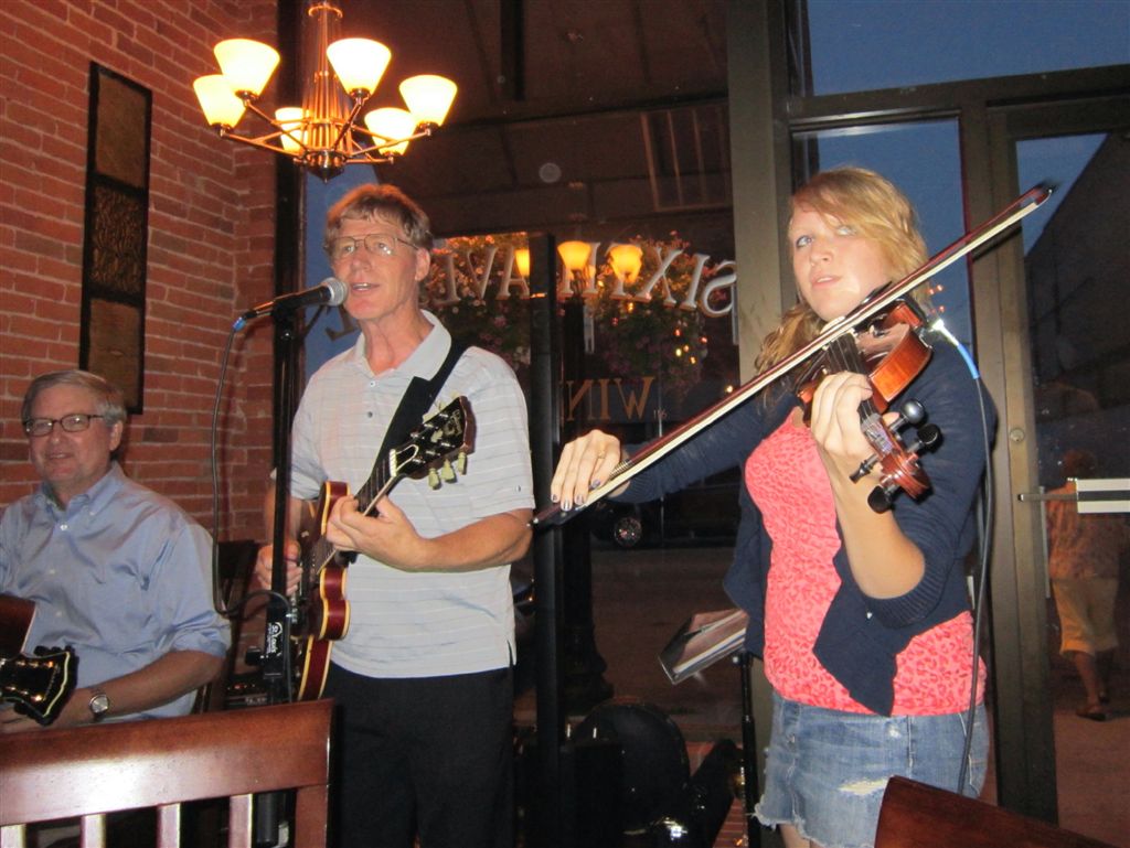 We received a nice surprise at SAWA last night. Our regular Thursday night music date – last night starring Emergency Stop (Terry Kennedy and Al Lieffort) -was enhanced by a late arrival by Sami Steidl. Sami had just received a gift violin from Tunesy Foslien (pictured with me at the winery in 2005) and wanted to give it a try with the boys. So, I was able to get a couple of videos: