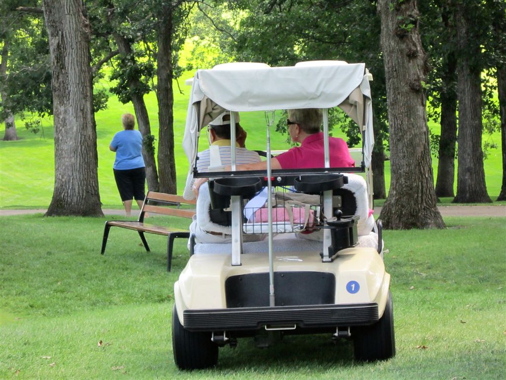 [Barb and Roger follow Maggie’s tee ball on No. 11.]