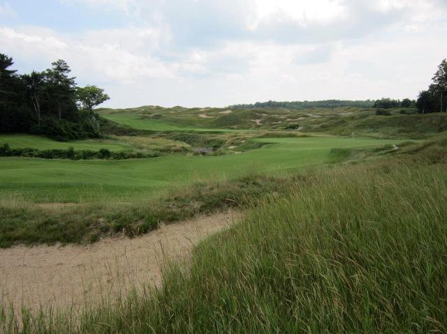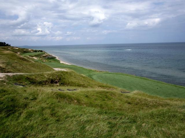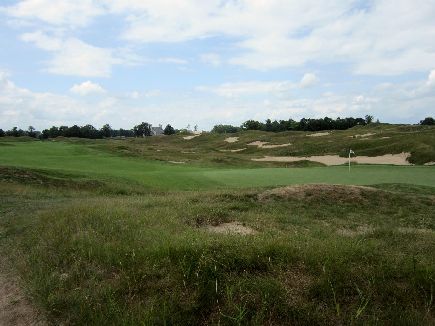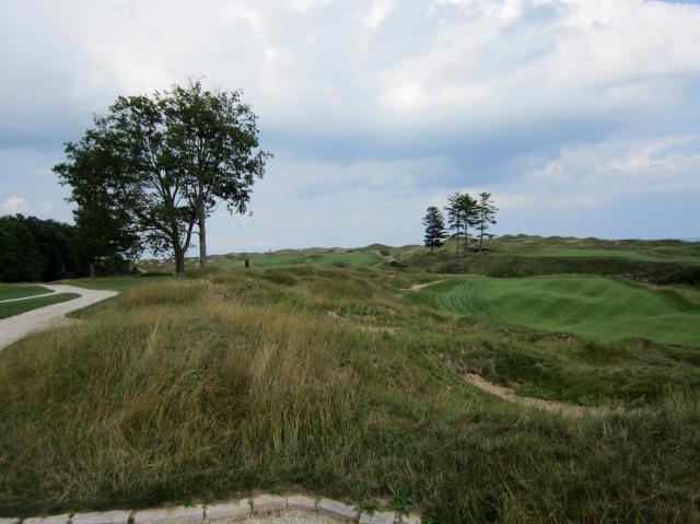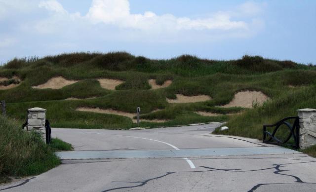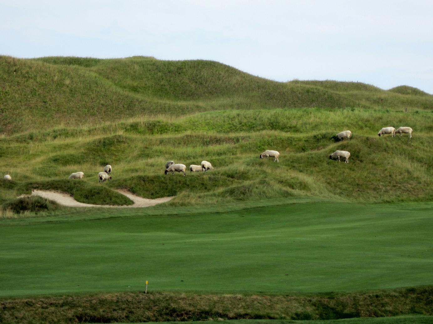 Then it was on to Kohler’s Whistling Straits Golf Club, just north of Sheboygan, and about 15 miles straight east from our camp. Very understated entry with no preliminary signs. We discovered you could get a tour – so we did. The green fees are $350, you must have a caddy for $60, and a recommended caddy tip is at least $35. Economy, schmeconomy – the course is booked solid every day. Absolutely beautiful setting – but it doesn’t look like there’s anyplace safe to hit a golf ball. Staff say most players come into the clubhouse after 9 holes to buy more balls. A highlight I wasn’t aware of – the course has 30 free-roaming sheep, and every night they return on their own to their on-course pen.