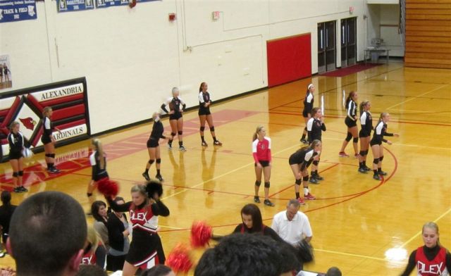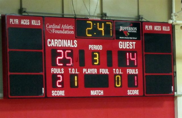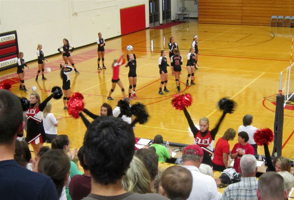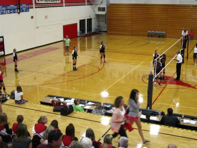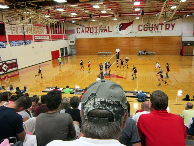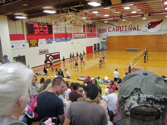 The Cards cruised through the next two games, winning 25-18 (not that close) and 25-14 – at that point we’re thinking the match should have been over because we should have won game 1. Then for game 4, the entire team “left” the court to go work on their history homework, or something? They were totally discombobulated throughout, and the final score, 15-25, was only made halfway “respectable” with a late run. So, it was on to game 5 – the deciding game which only goes to 15. At this point the senior citizens among us (Super Fans Barb and Roger Riley, behind me, and Ruth (Helie) and Alvern Anderson, in front) were starting to grumble about having to spend 2 1/2 hours sitting on hard wooden bleachers with no backs – raising, again, a hew and cry for a new high school!