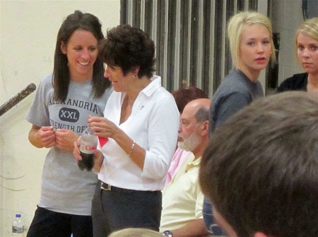 [Sheree Oberg, white top, is “publisher” of the Cardinal Connection which tells us what just happened and what’s coming up. She also patrols the student fans to make sure they maintain a proper sense of decorum. I believe that makes her eligible for combat pay! (But seriously folks, they have fun with each other.) 😉 Upon further review, that appears to be Cardinal basketball point guard, Cara Wood, to Sheree’s immediate left – probably there to scout Brianna Rasmussen (see further below).]