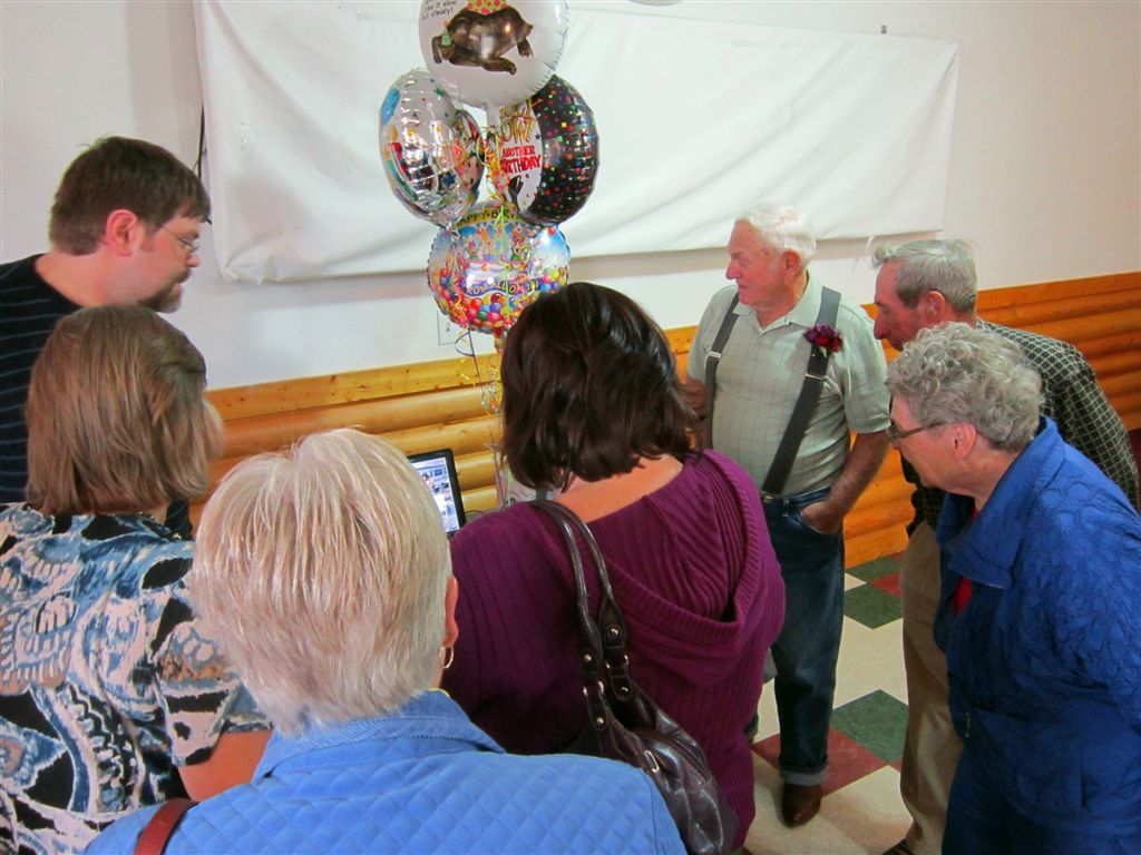 Yesterday began with a visit to the Carlos Town Hall for Bill Malvin’s 85th birthday party – and who doesn’t like a good birthday party? Bill and Barb are featured in the current Douglas County DFL brochure. That’s Bill in the suspenders holding forth at the entrance with a display of family photos. And of course there were good eats.