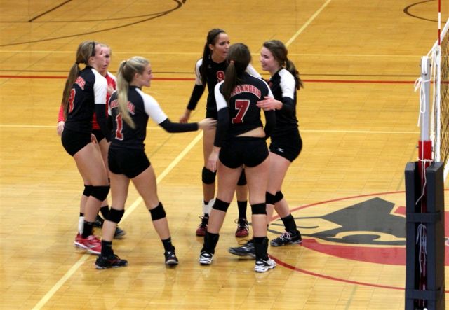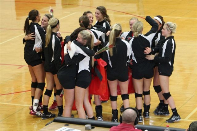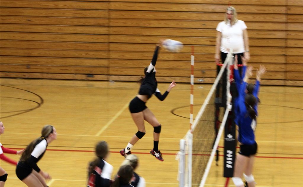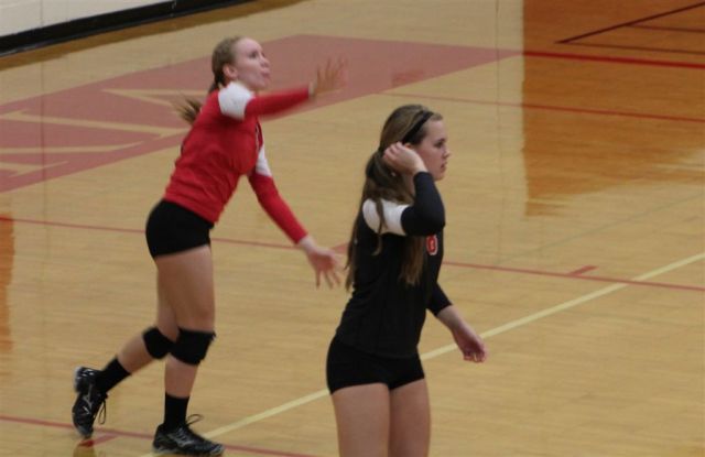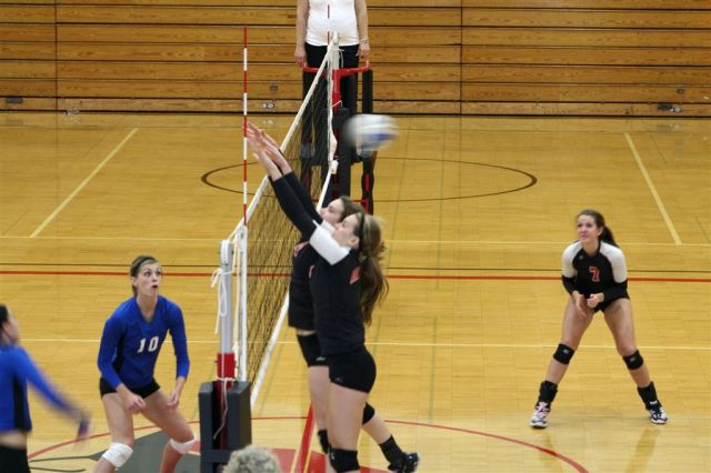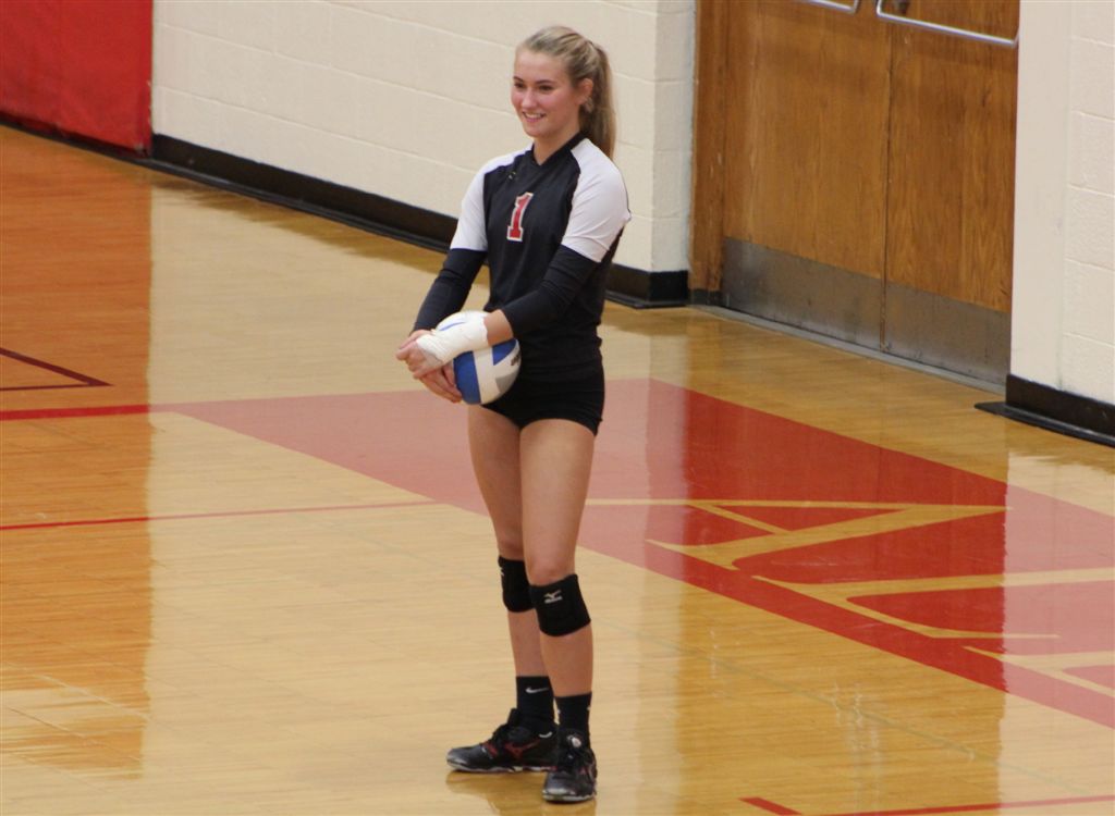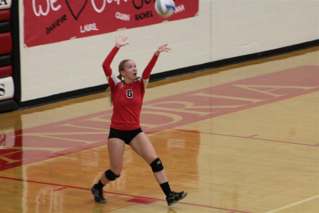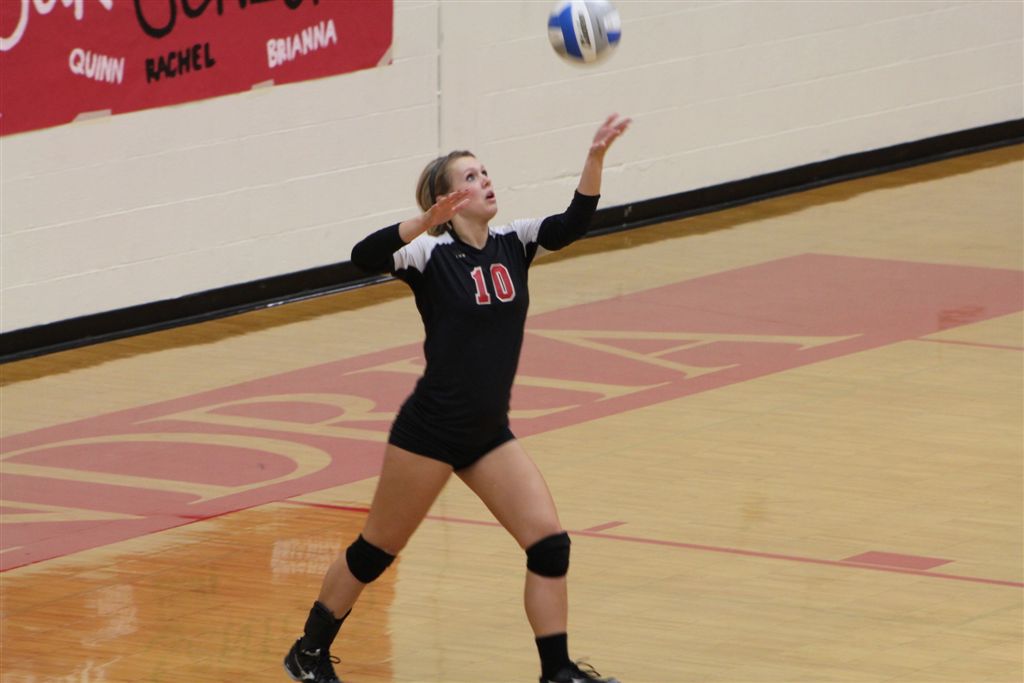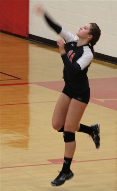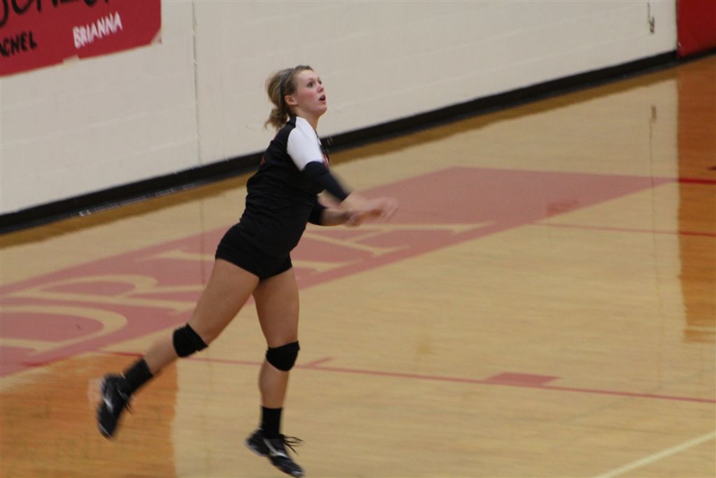 [Sophomore Amanda Christianson with the 3.9 degree-of-difficulty jump serve.]