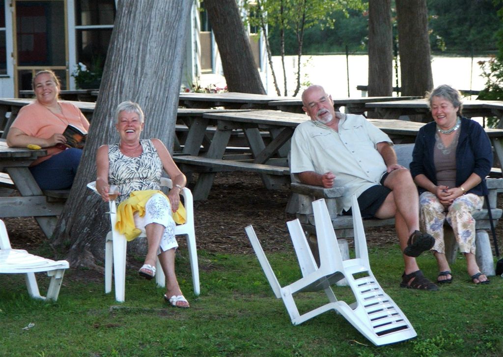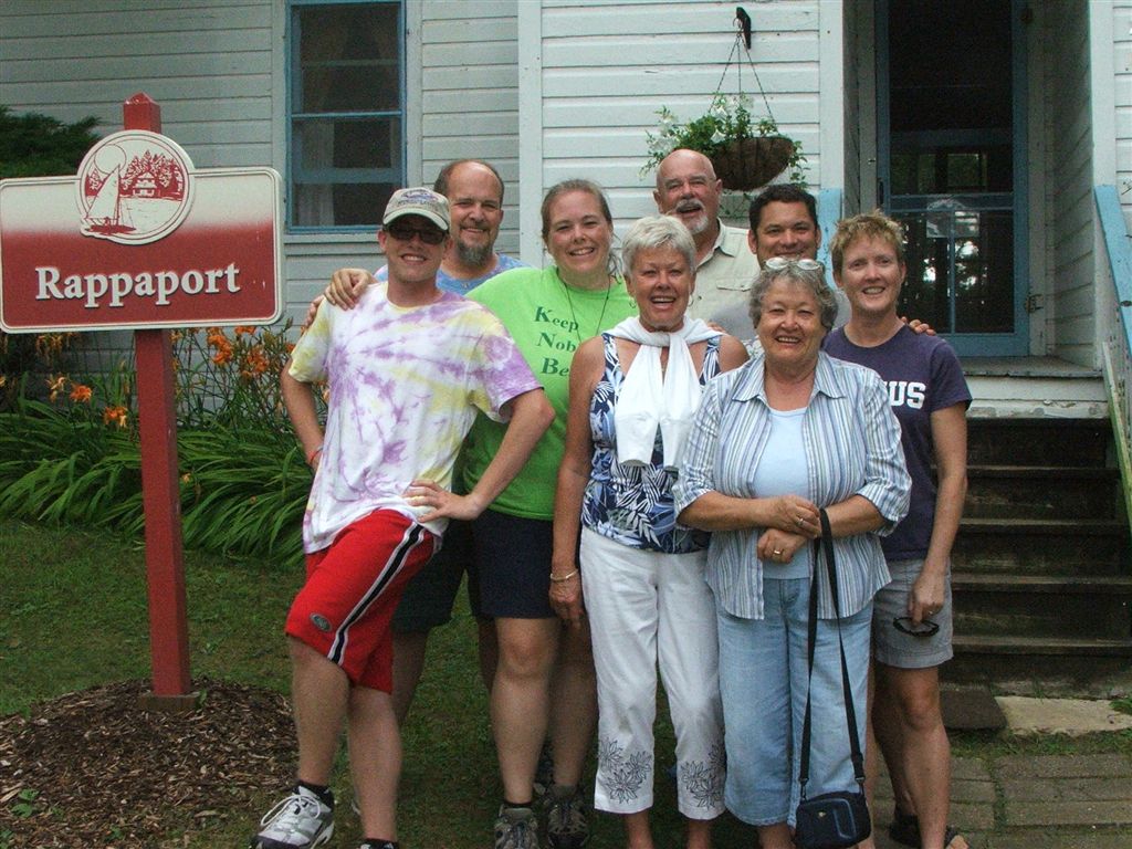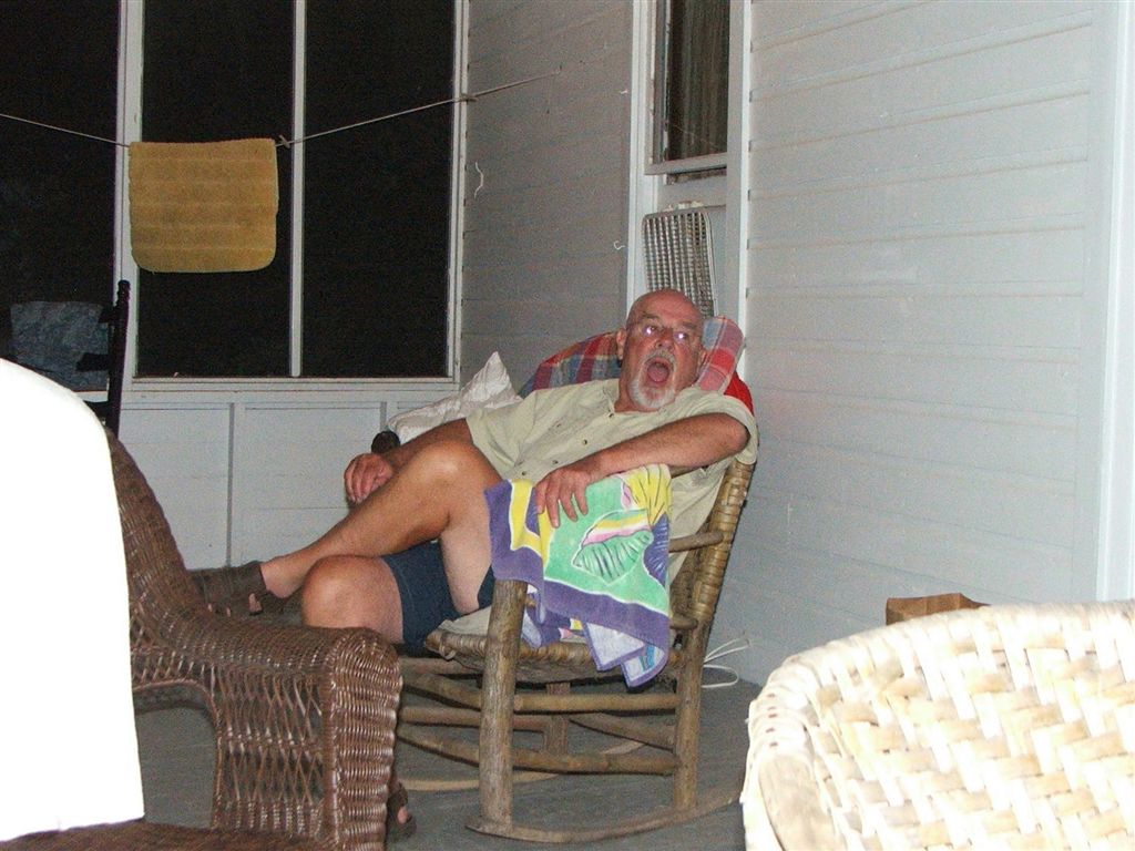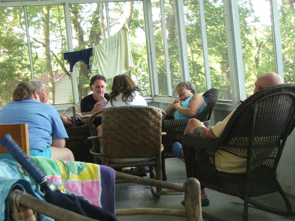 [Rita on porch with late arrivals – daughter Beth and son-in-law Chris.]