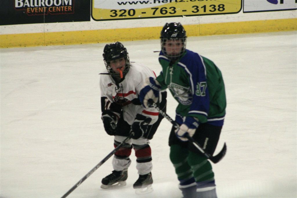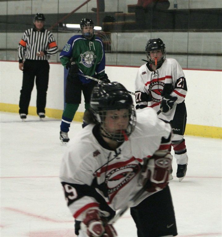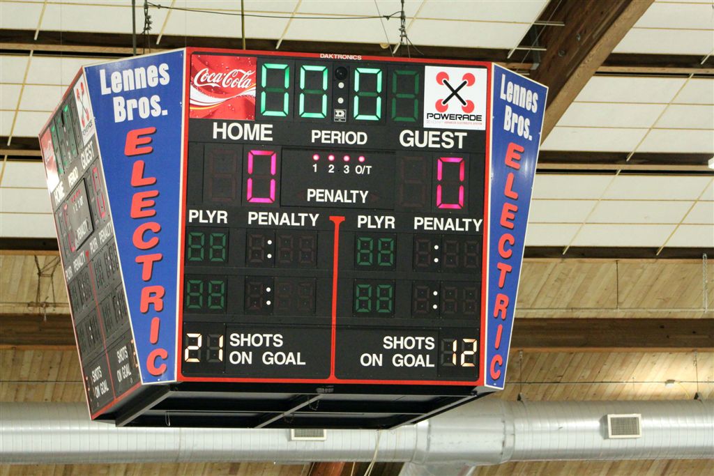 OK, now back to hockey. We hosted Sartell-St. Stephen-Sauk Rapids-Rice last night. They are a conference team – and a reminder our schedule includes mostly class AA teams because it’s hard to find enough class A teams to play against. Sartell and Sauk Rapids high schools, individually, are as big as Alex, so we’re always at a disadvantage in the numbers game. Not whining, just the facts. The scoreboard reflects the final score of the JV game. The two home JV games so far have ended in 0-0 ties. Again, we had a big shots-on-goal advantage – a good sign. I decided to spend a lot of camera time this night on the JVers -several players have been on that team most of their high school careers and we have enjoyed watching them play as well.