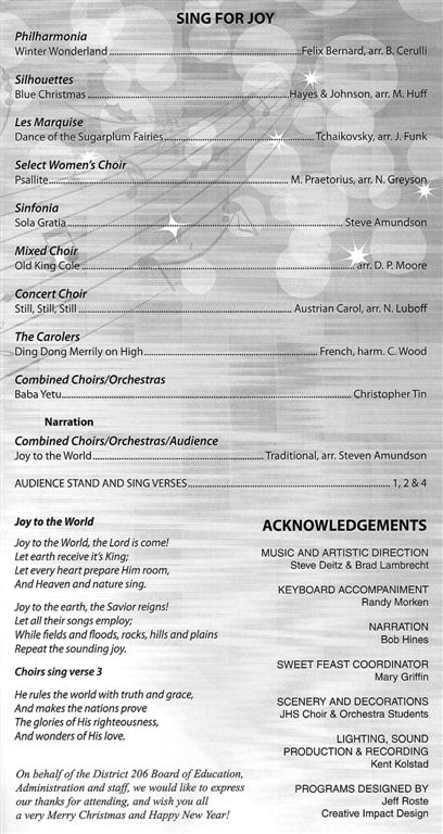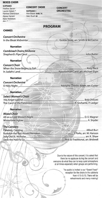 Yesterday was the annual Jefferson High School Choir and Orchestra Christmas Concert. But before we go any further, we have to first discuss the always number one topic of conversation in Minnesota – the weather. As noted in the above photo, the supervisor arrived at the high school – sans jacket, coat, boots, or other seasonal accoutrements! This was December 18th! In Minnesota! There is no snow! People actually came to the concert wearing shorts! What’s happening? (We now leave our bizarre weather rant for the rest of the story.)