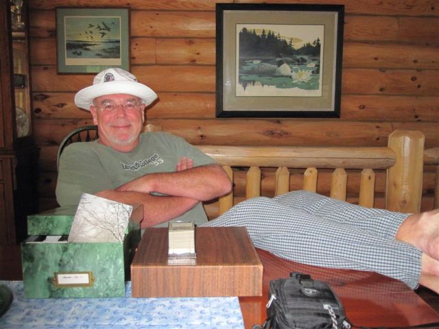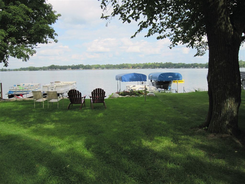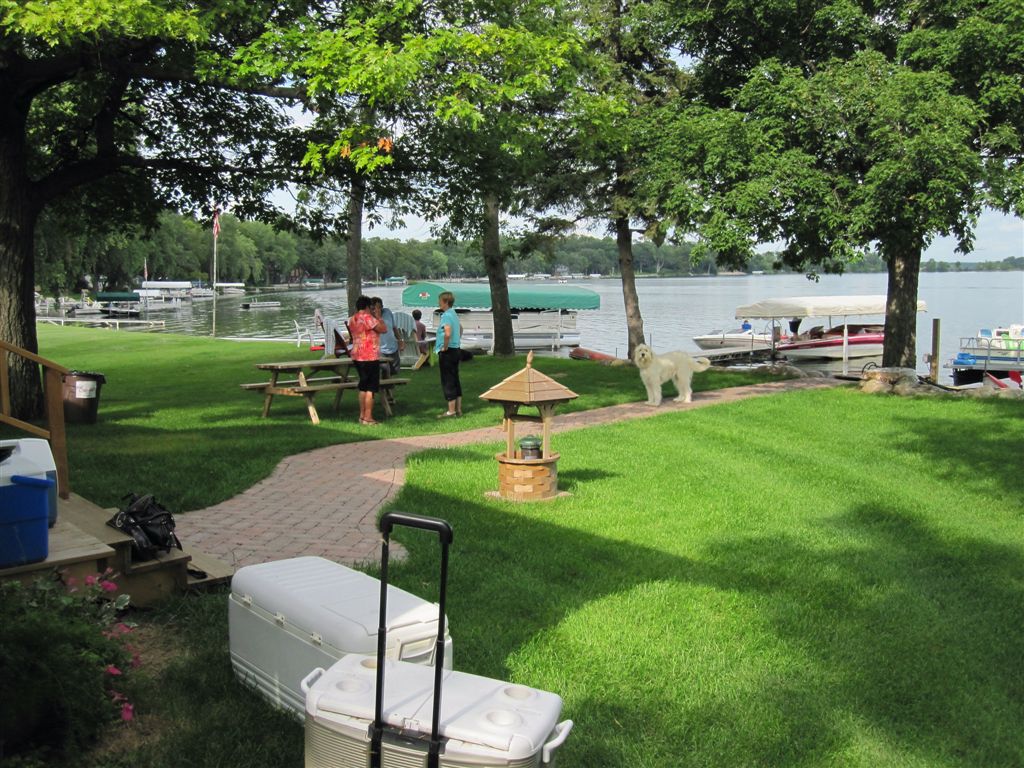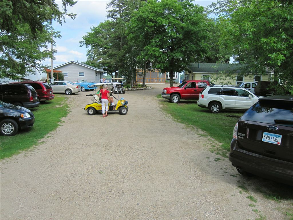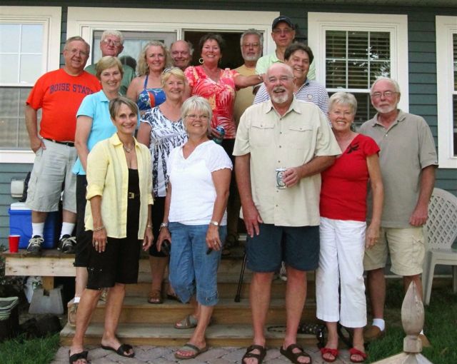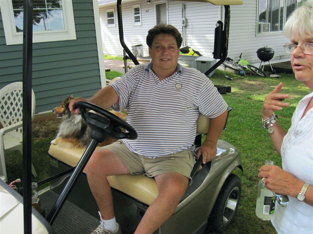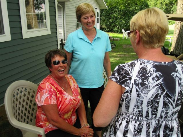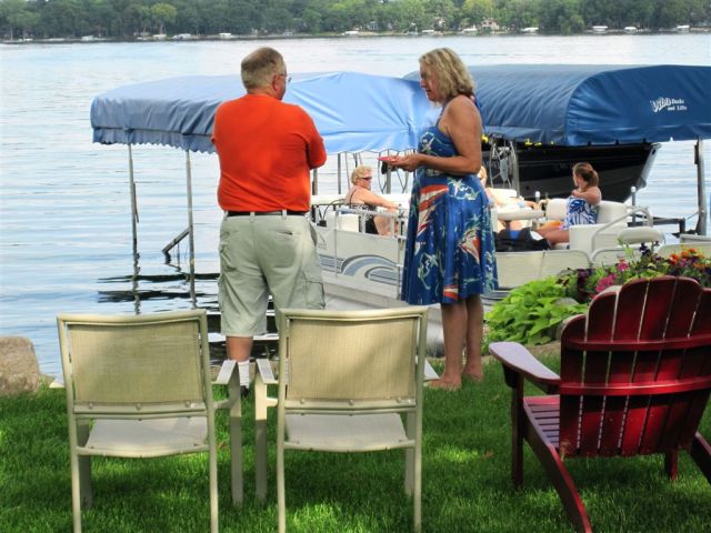 So, on Friday afternoon we arrived from the SW side of big Darling to the west side of Little Darling [Editor’s note: People who live there do not much care for the term “Little Darling.” Can’t say as I blame them. How ’bout the north bay of Lake Darling?]. The Larson Butcher and Watson compound had a “Parking” sign up in the car window. All were greeted by various valets on golf carts (Ruthie got a lift from Perry Butcher). Once around to the lakeside, we discovered the HQ chatting with Bonita Olson Gilbertson and somebody partially obscured. The view of Lake Darling was just great [have you ever noticed how waterside shots are enhanced by having Adirondack chairs in the foreground?]. The Chairman greeted Kathy Josephs Faust from the helm of his limo, and Bonita and the HQ yucked it up with Karen Meyer Bird. Finally, John Herdan and hostess Betty Larson Butcher discussed the finer points of trumpet fingering on Mahler’s “Adagietto from Symphony No. 5.” More anon.
