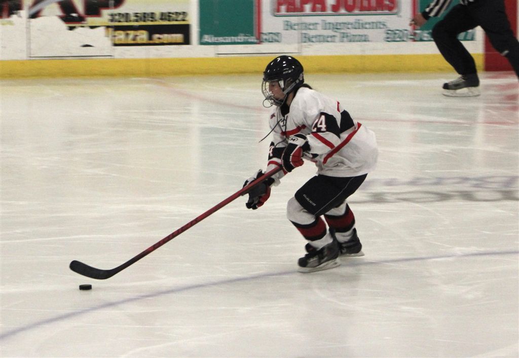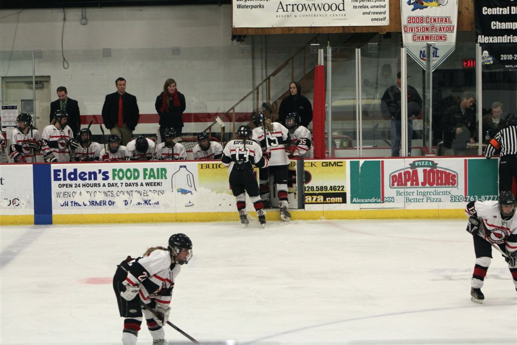 [Super Fans Barb and Roger Riley sang the National Anthem again last night. The Cards remain undefeated when they have done so. The “Guest” was the Fergus Falls Otters – gotta get our scoreboard lights fixed, the Cards had 28 shots-on-goal though it looks like 23.]