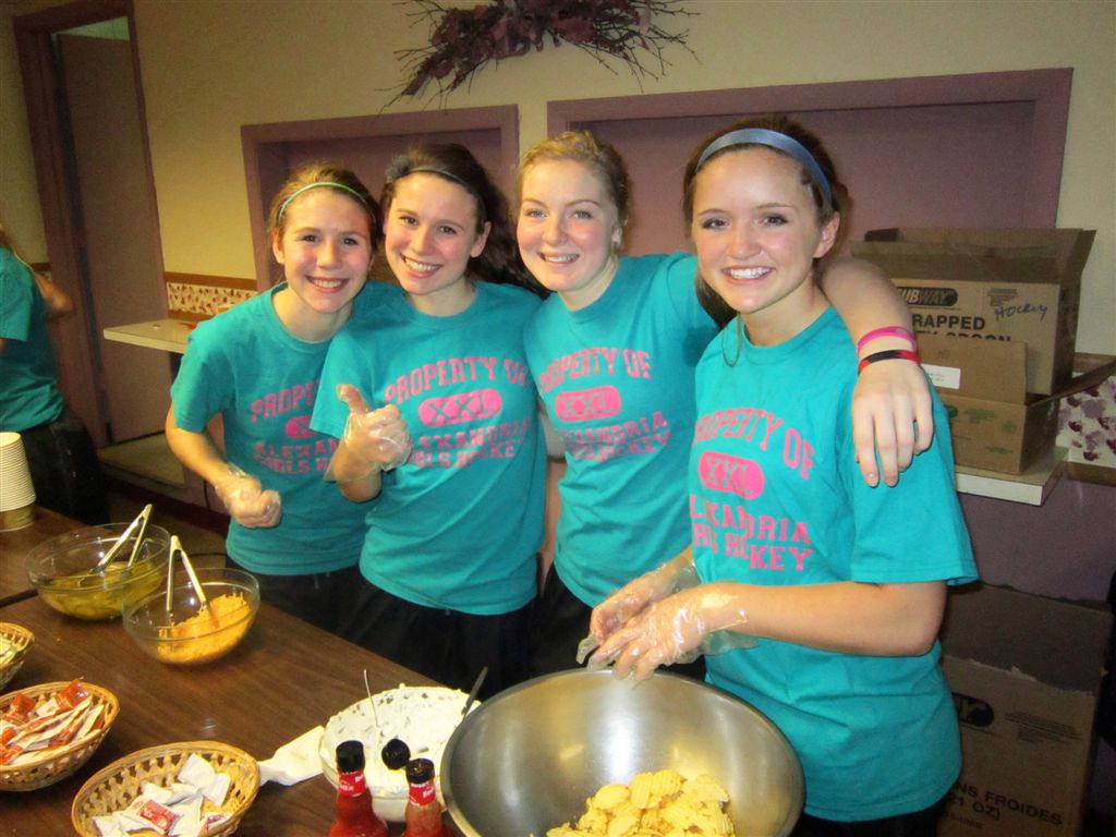 [The serving line. I believe mostly JV here so I had to regale them with the story of Super Fan “Weakie” Annen once asking the 1st set of servers where “the stars” were? Well, they in no uncertain terms told him where he could get off – never mess with hockey players!]
