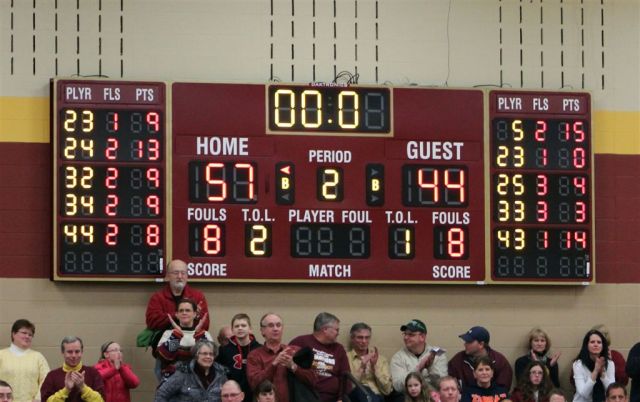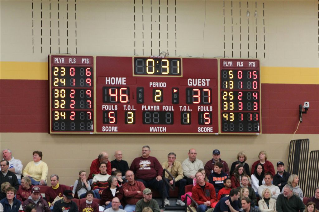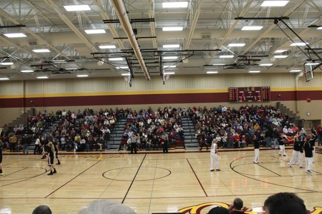 We began with a lovely repast at Mable Murphy’s – a petit filet, hashbrowns, a nice glass of cab . . . now, where were we? Oh yeah, we arrived at the school an hour before tip-off – plenty of time we thought, plus we could watch the JV game. The parking lots were already packed! From our finally discovered spot in Lot ZZ, we were able to catch a dog sled back to the school.