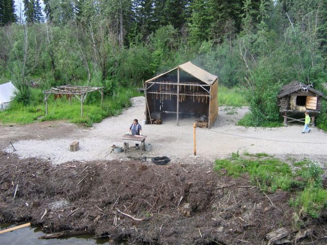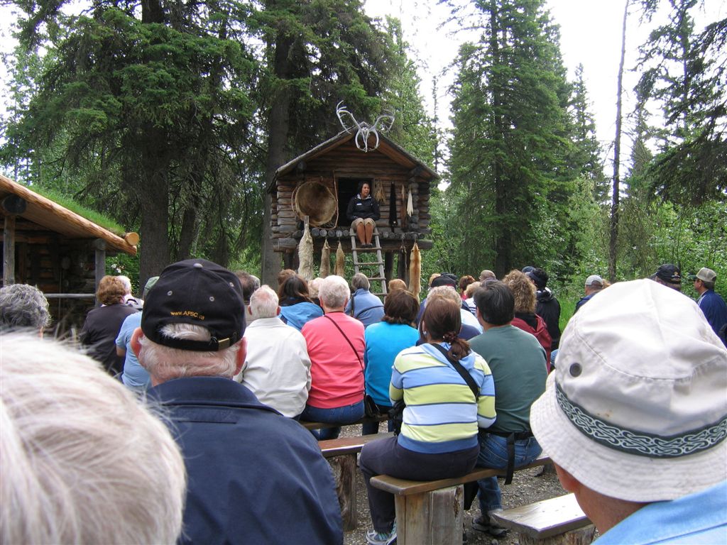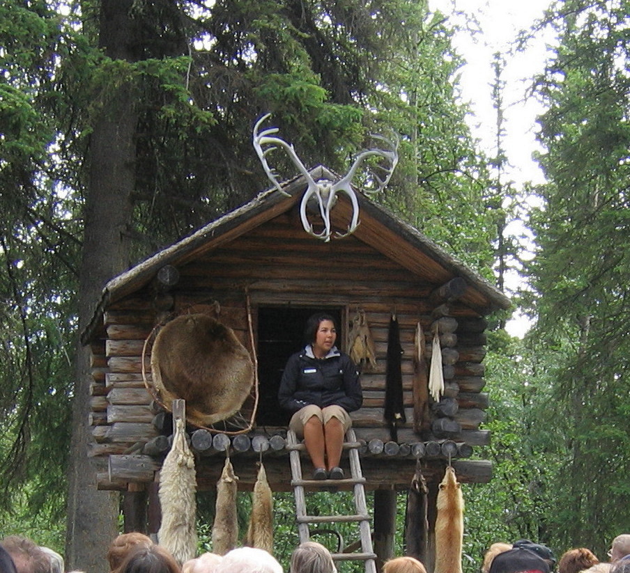 [So, here are Ida (standing) and Grace (sitting at ladder top), Athabascan college students (who were terrific), telling the assembled masses how the Athabascans (native people of interior Alaska) survived without a Super WalMart just down the street.]