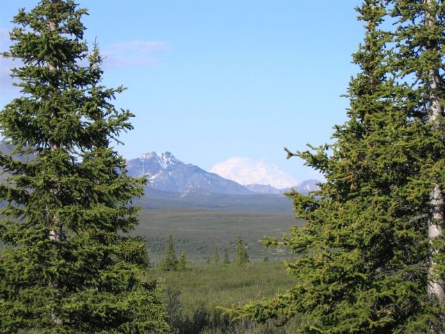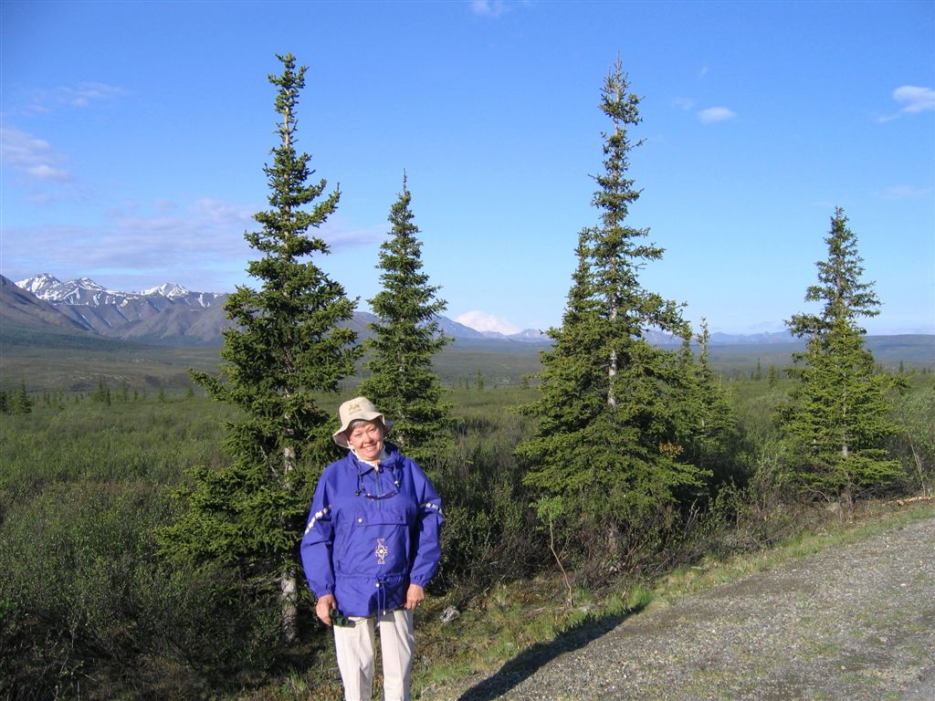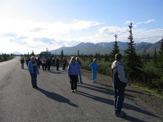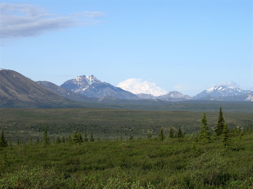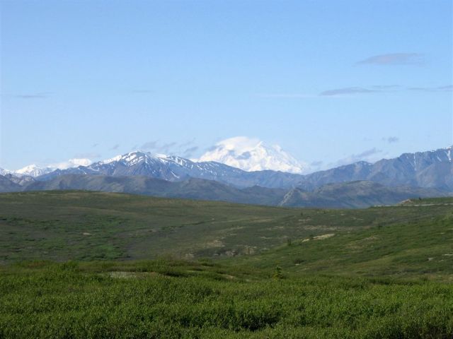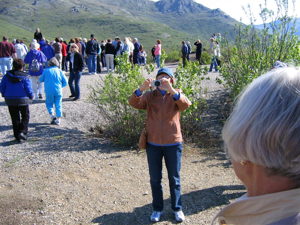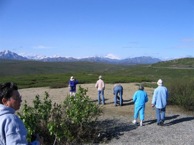 Our first sighting of Mt. McKinley, a/k/a, Denali. We are told how fortunate we are to be able to see the mountain – it, we are told, is usually swaddled in fog or clouds. (I was similarly advised of such “luckiness” at Fujiyama and the Matterhorn!) We countered by telling our tour guides how fortunate they were to have us as tourists! Ta-da!