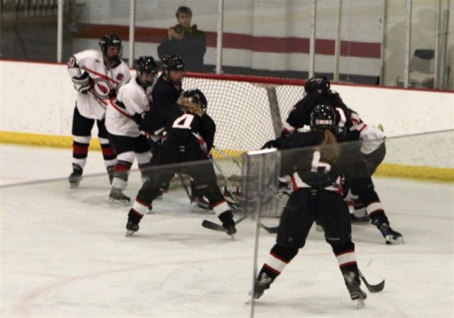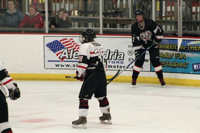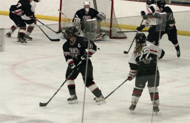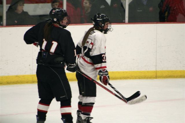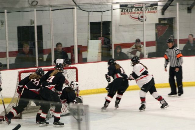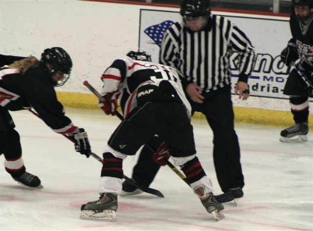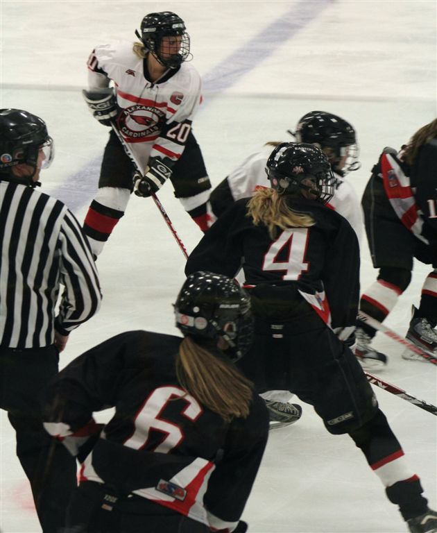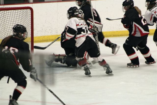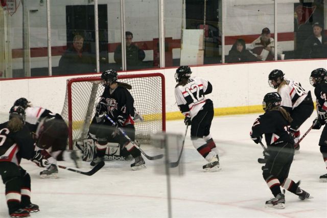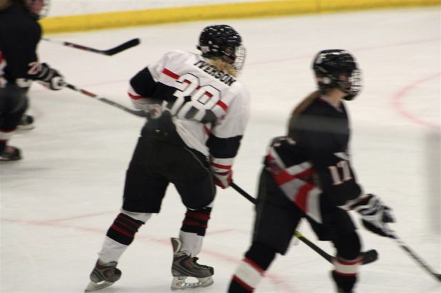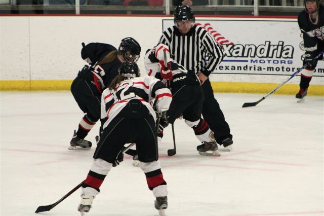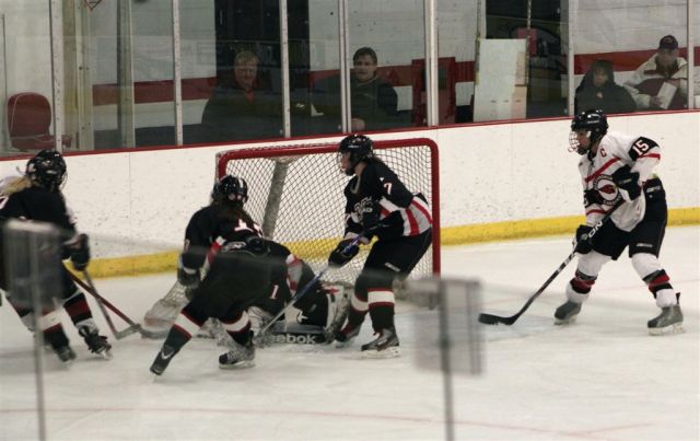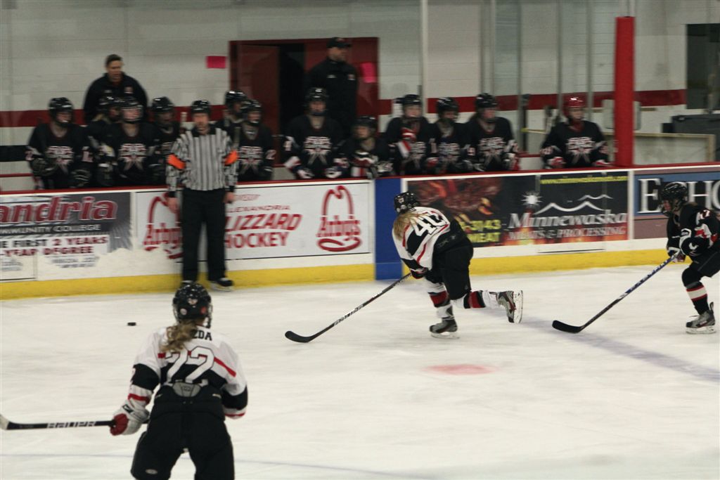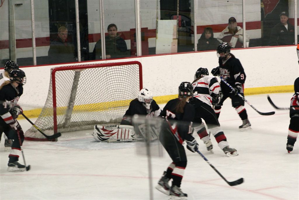 But the game low light was losing another player to injury. Early in the first period, after a scrum in front of their goalie and after the whistle had blown, Alia Kopischke was knocked to the ice, and suffered what after game reports indicated was a concussion. We couldn’t believe there was no penalty call. Kalley Kragenbring has been out two weeks with a concussion and will be out at least another week; Britni DelCastillo was also out with a knee injury (bursa sac). That’s three starting forwards – in a sport where a lot of teams only play two lines. It’s not an excuse – as Sgt. Joe Friday would say, “Just the facts, ma’am.”