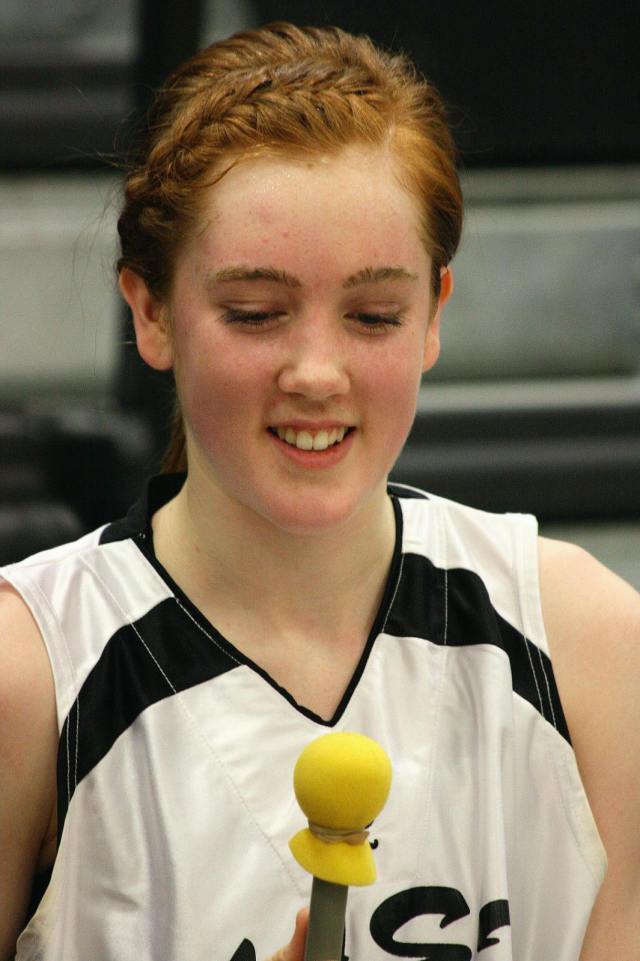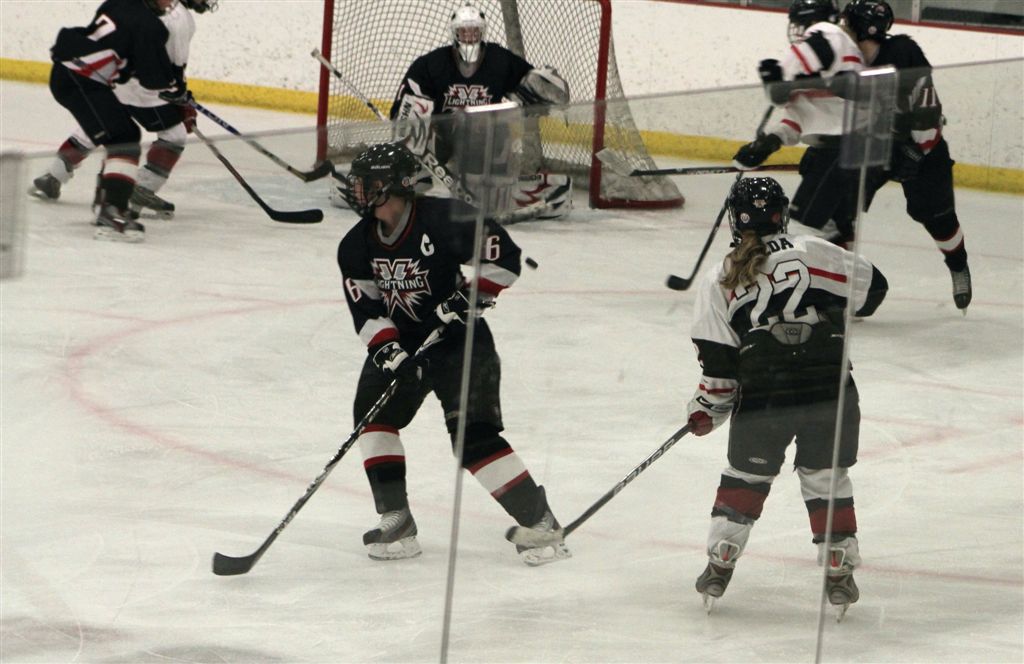 [After Kalley was injured, Taylor Ellingson (24) was moved from defense to center on the line with Rachael Finley (15) and Alia. After Alia got hurt, freshman Kaila Dewanz played left wing.]