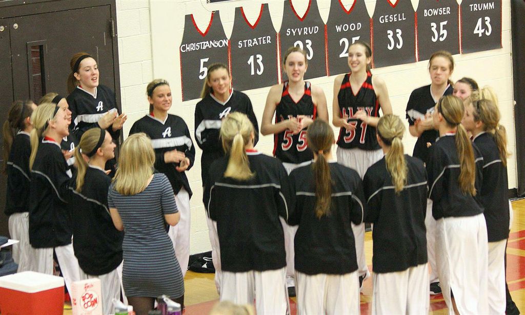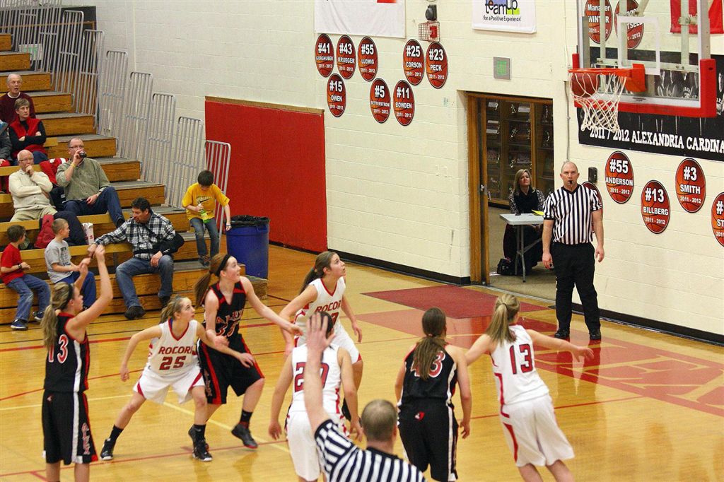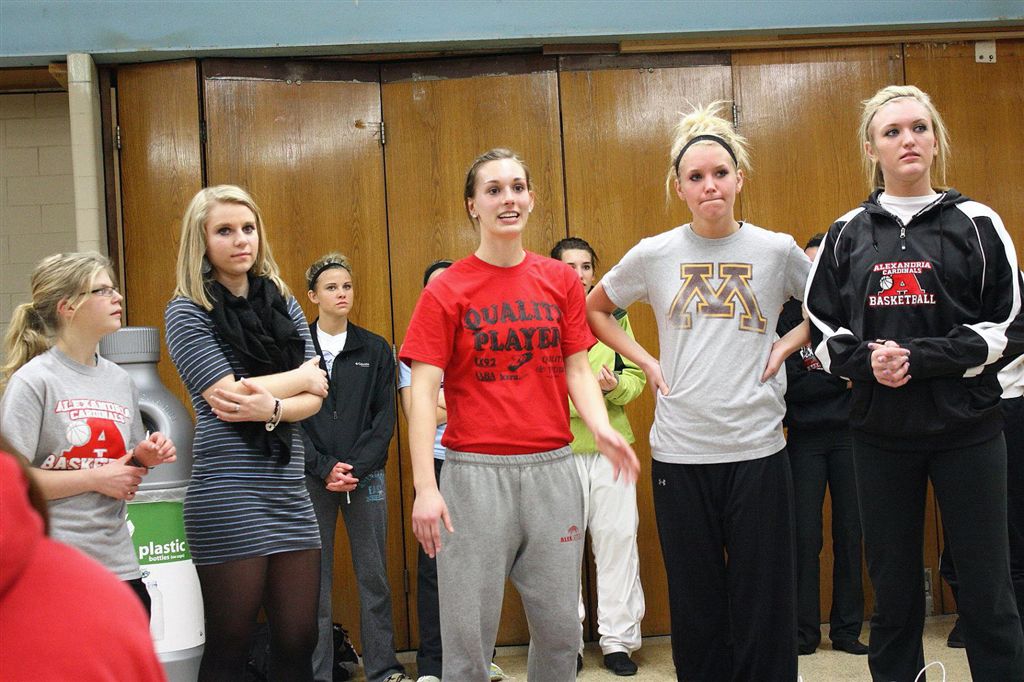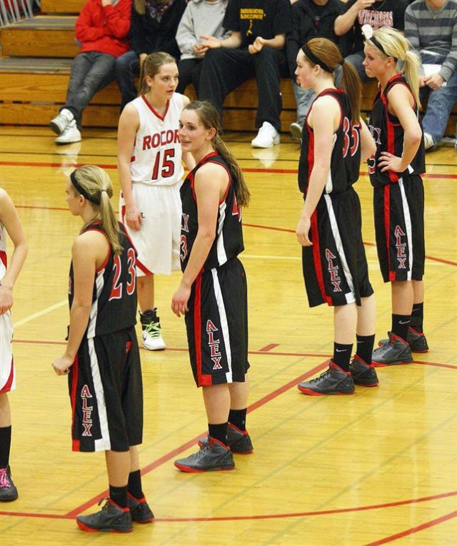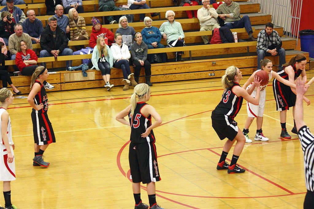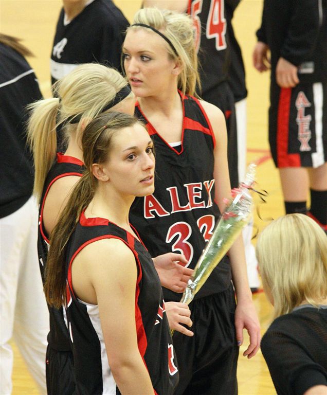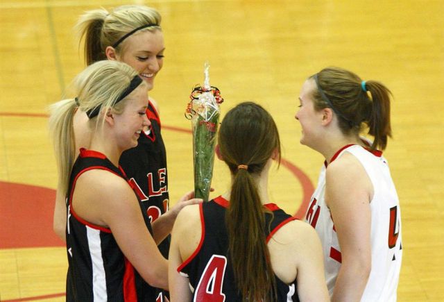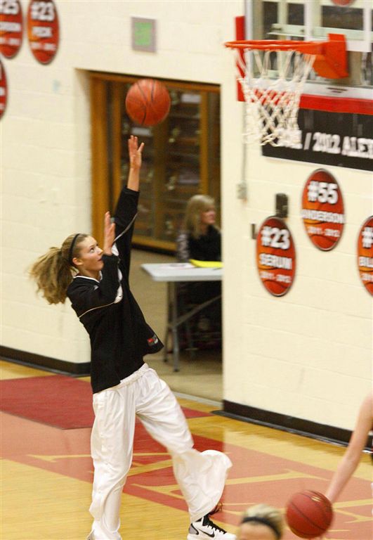 Meanwhile, back at the high school (oh yeah, I said that already). Senior night for the girl roundballers took place on the same night we repaired to St. Cloud for the girls’ hockey section finals. Fortunately, I knew the staff photographer was there to “cover” events at JHS. Had he not, I would have been in a real dither! [a dither, by the way, is a mythical place just on the leeward side of a cappella (see further references below).] If I had been asked to choose, I would have said it was the moral equivalent of asking which child do I like best? Well, that’s not valid since I don’t have children. It would have been like asking which cat do I like best? But we don’t have cats anymore. I guess I just don’t have a good metaphor? [a metaphor, incidentally, is also a mythical place, but in a totally different province from a dither and a cappella.] Now aren’t you glad you have someone who will provide all this useless information free of charge? Oh, we played Rocori.