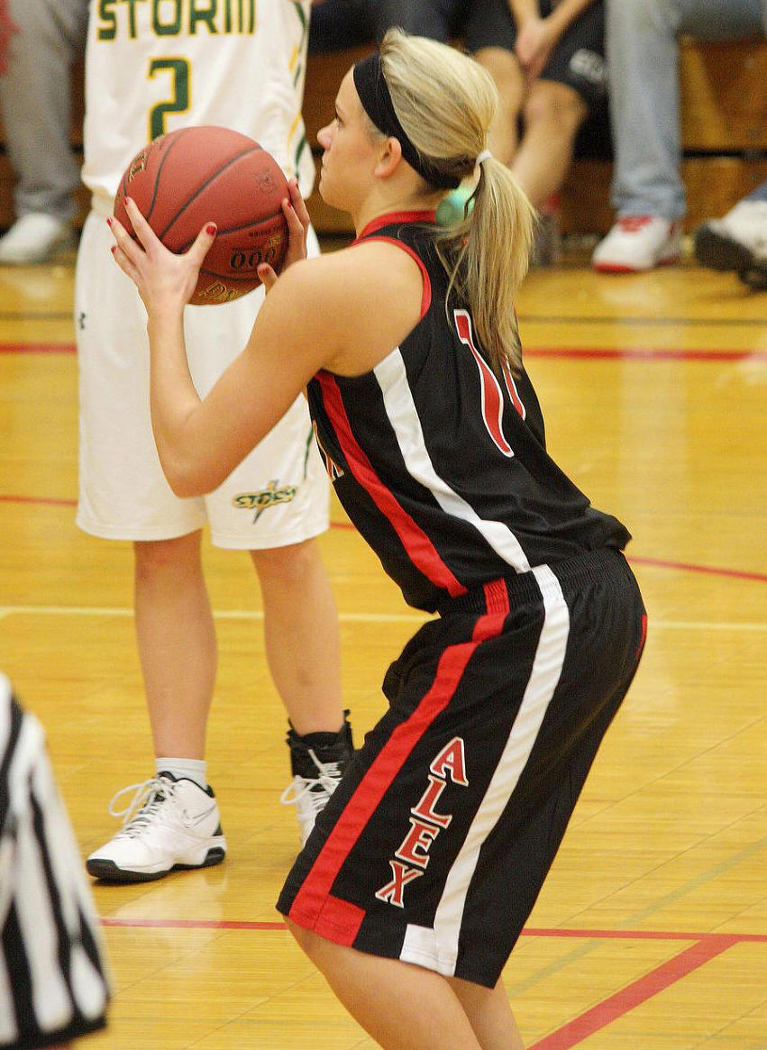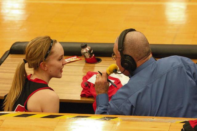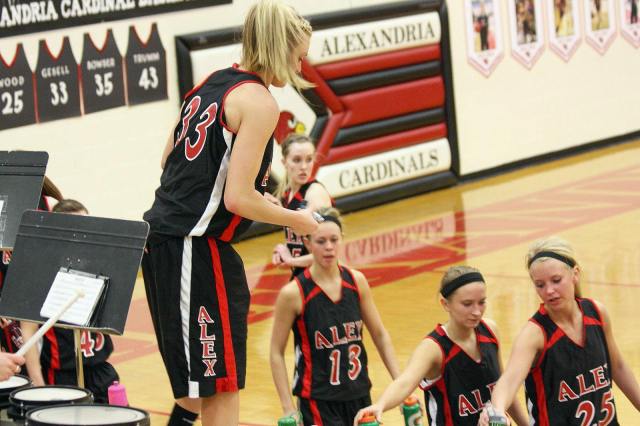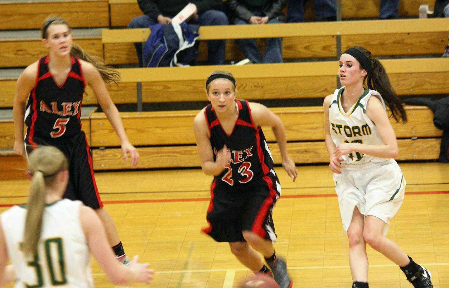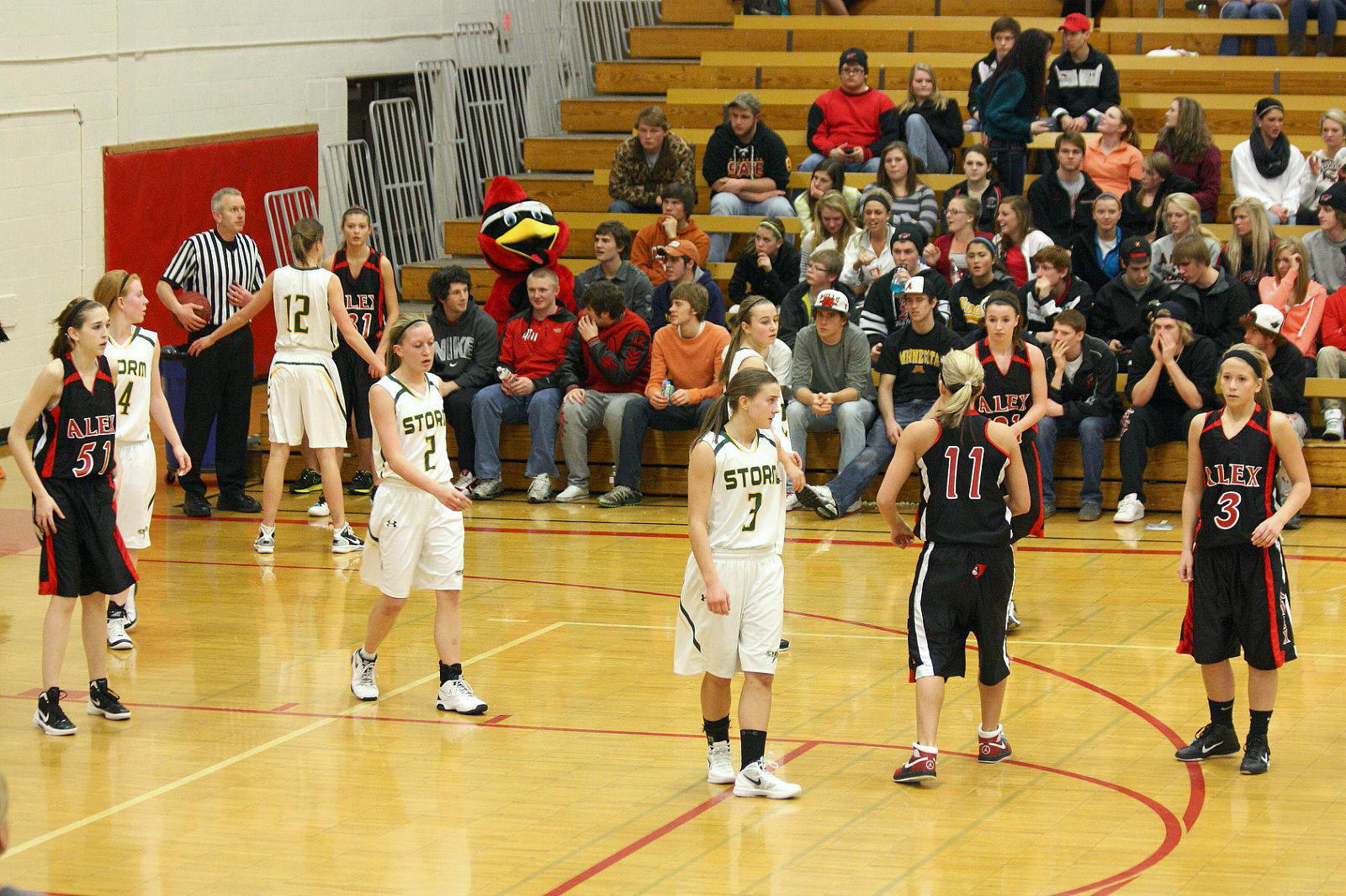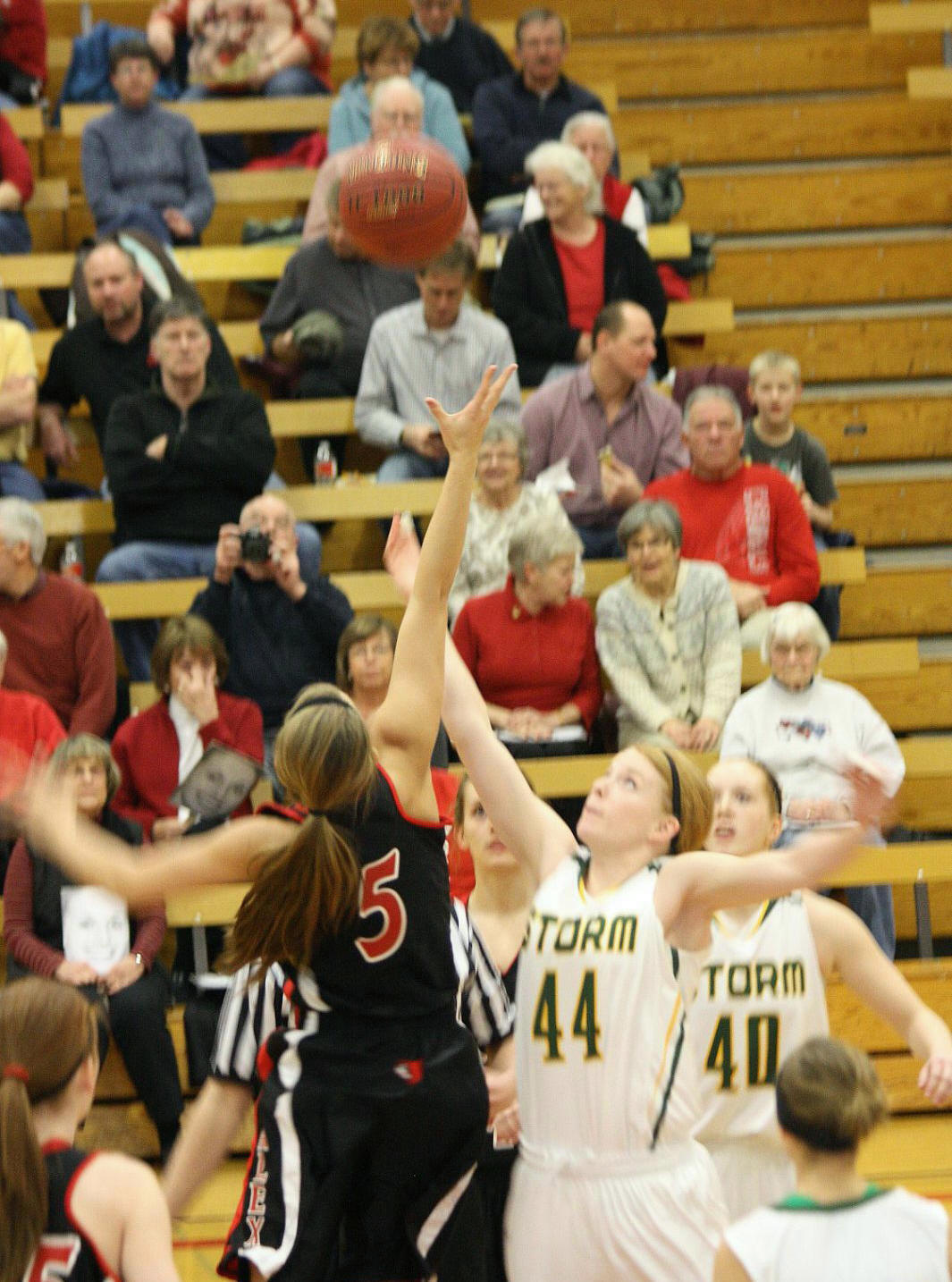 Lauren Trumm’s fan club – well, at least two of them. When young girls can have high school role models, that obviously helps establish and maintain solid programs! 🙂 This, and the following photos, are by the staff photographer of the opening section game against Sauk Rapids. As you may recall, we fans in the stands and the KXRA broadcast team could never remember a game that started 41 – 0?