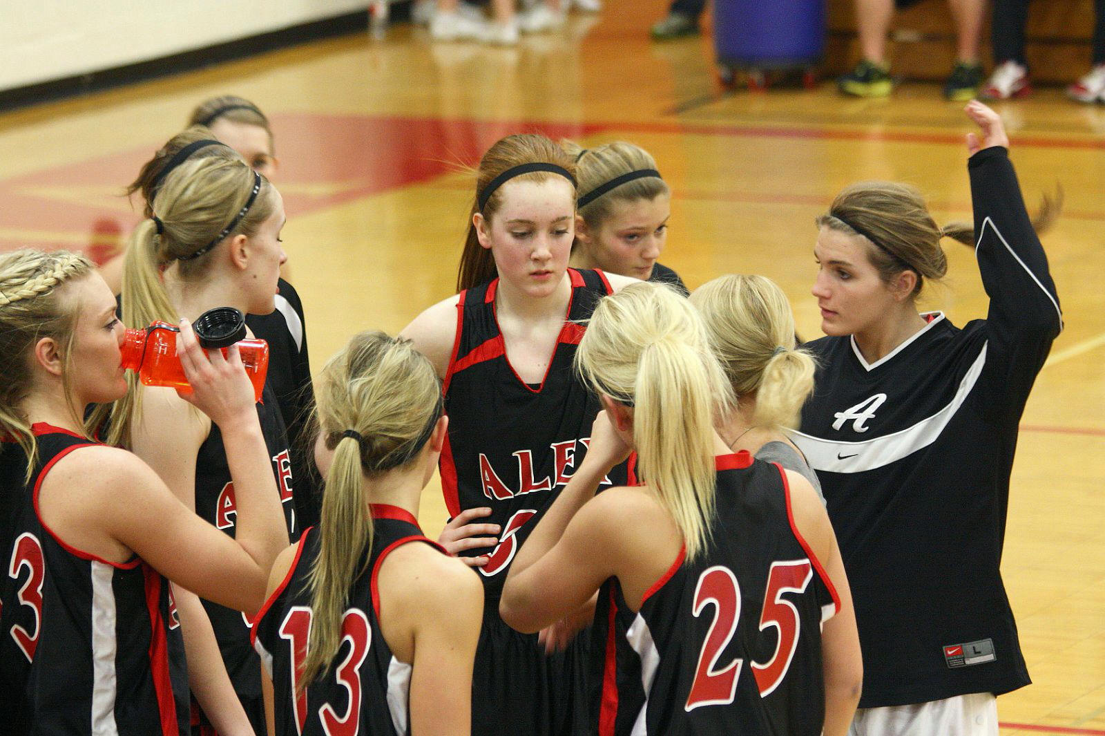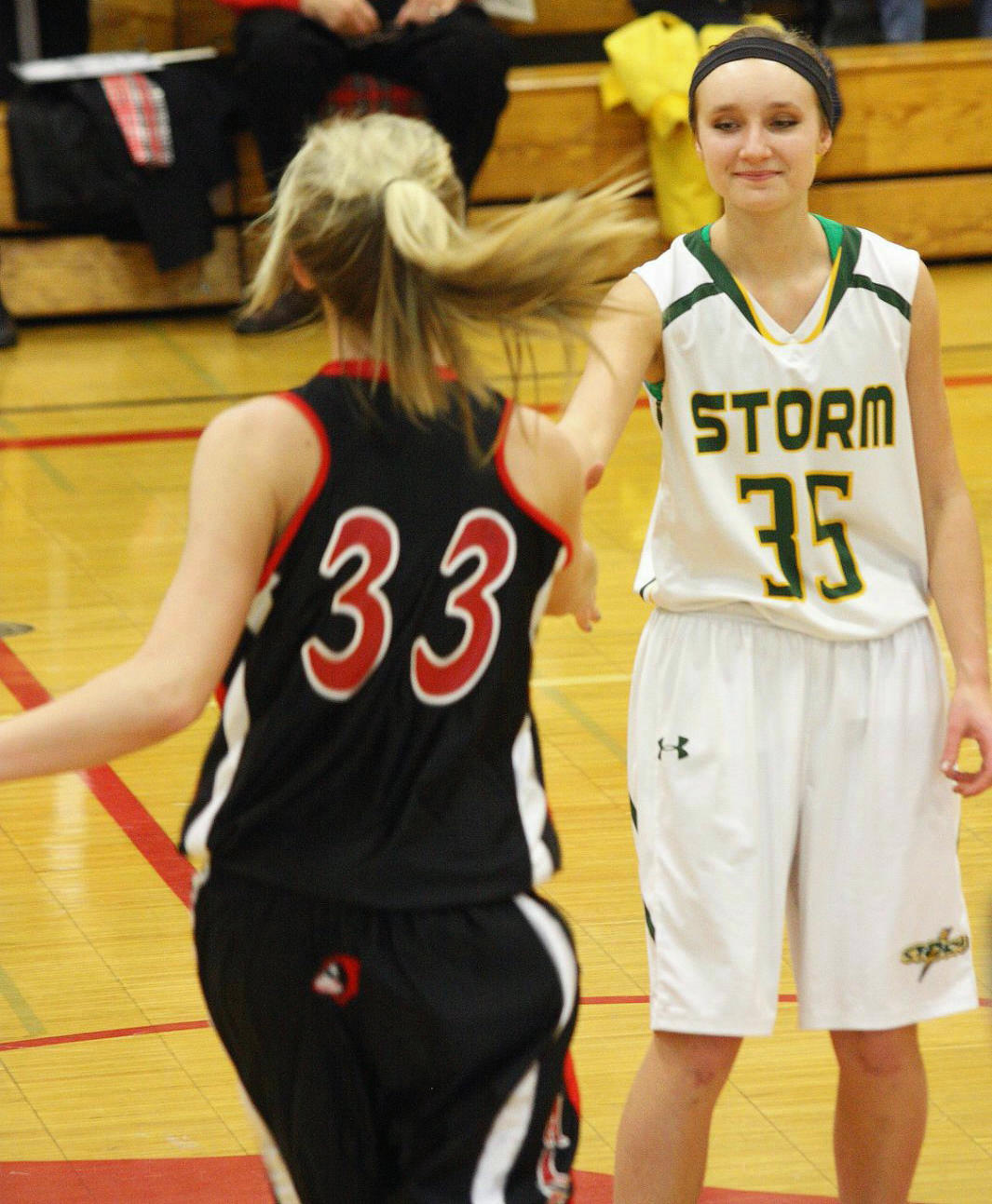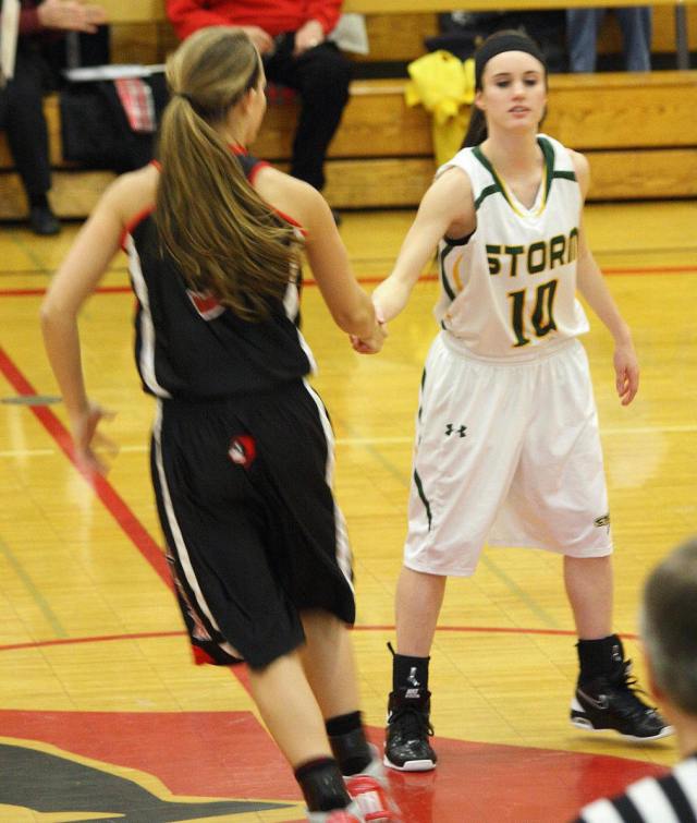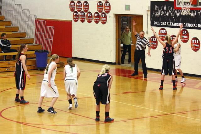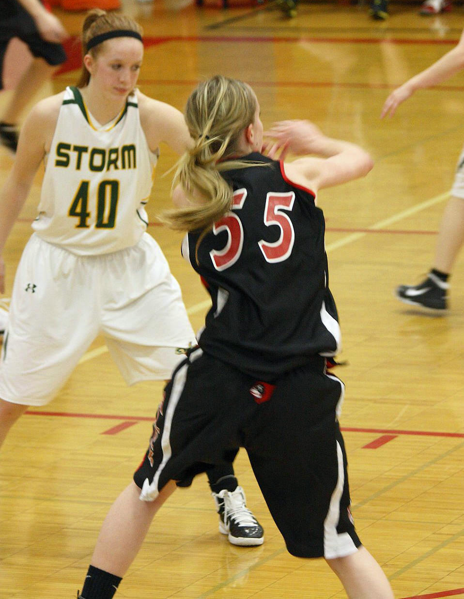 Lauren Trumm’s fan club – well, at least two of them. When young girls can have high school role models, that obviously helps establish and maintain solid programs! 🙂 This, and the following photos, are by the staff photographer of the opening section game against Sauk Rapids. As you may recall, we fans in the stands and the KXRA broadcast team could never remember a game that started 41 – 0?
