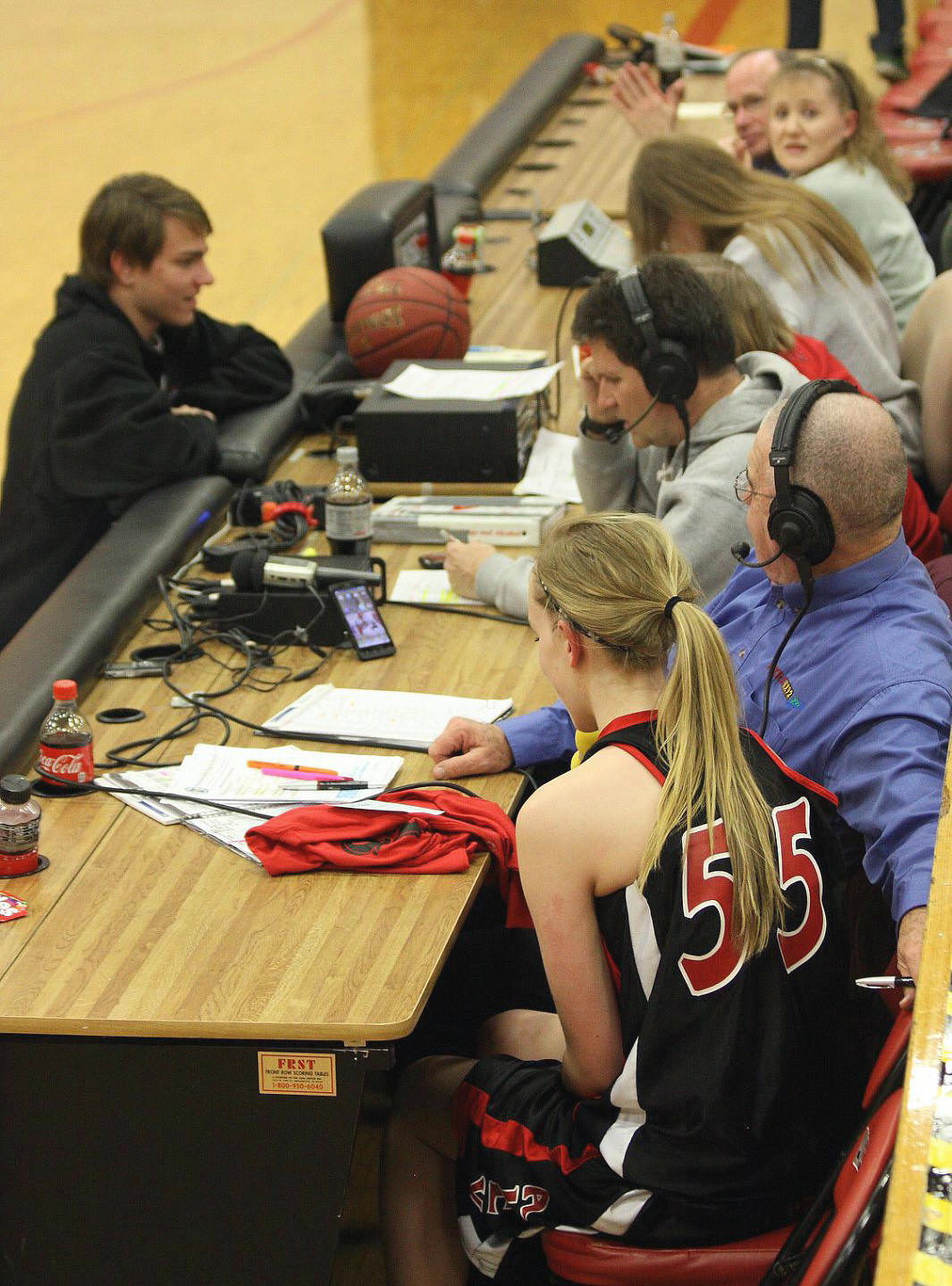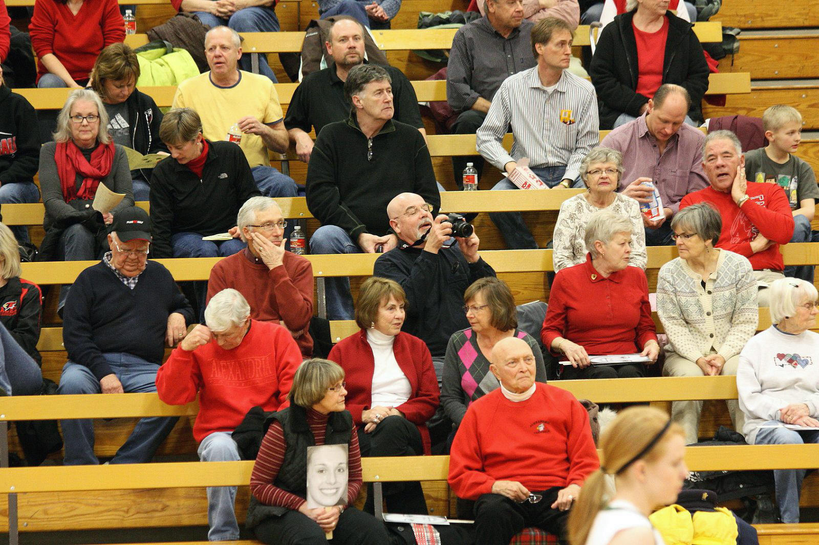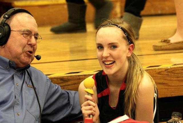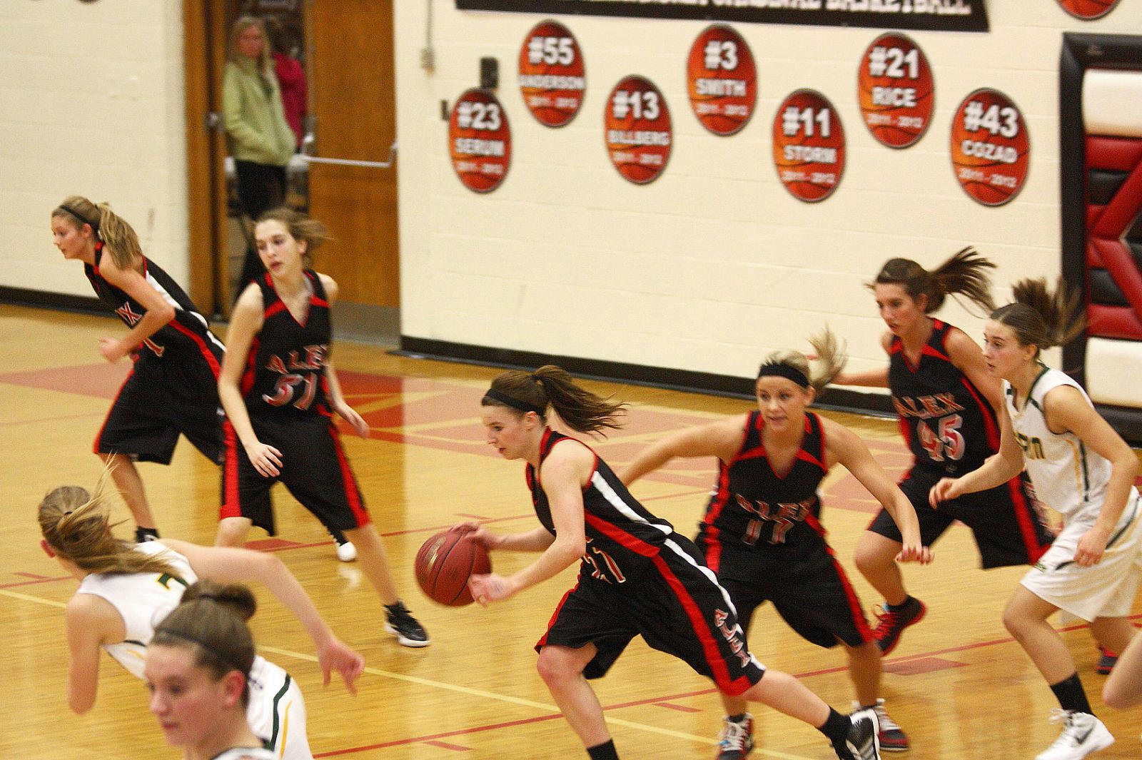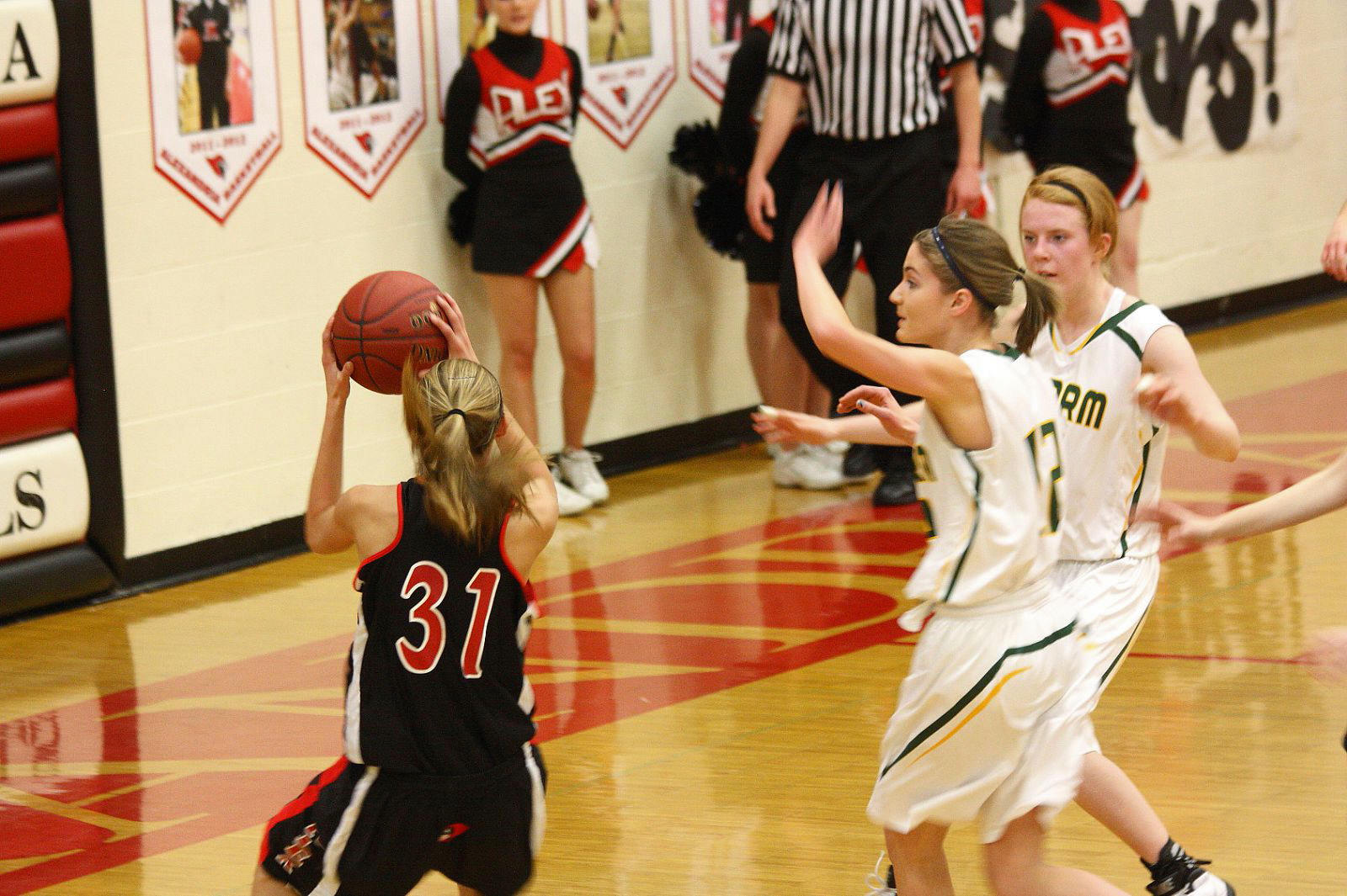 Lauren Trumm’s fan club – well, at least two of them. When young girls can have high school role models, that obviously helps establish and maintain solid programs! 🙂 This, and the following photos, are by the staff photographer of the opening section game against Sauk Rapids. As you may recall, we fans in the stands and the KXRA broadcast team could never remember a game that started 41 – 0?