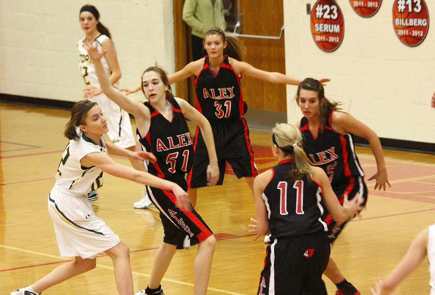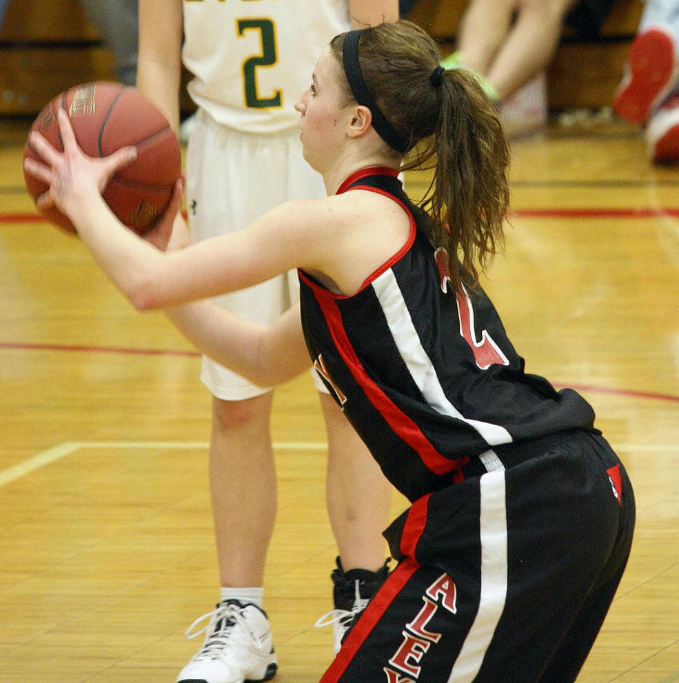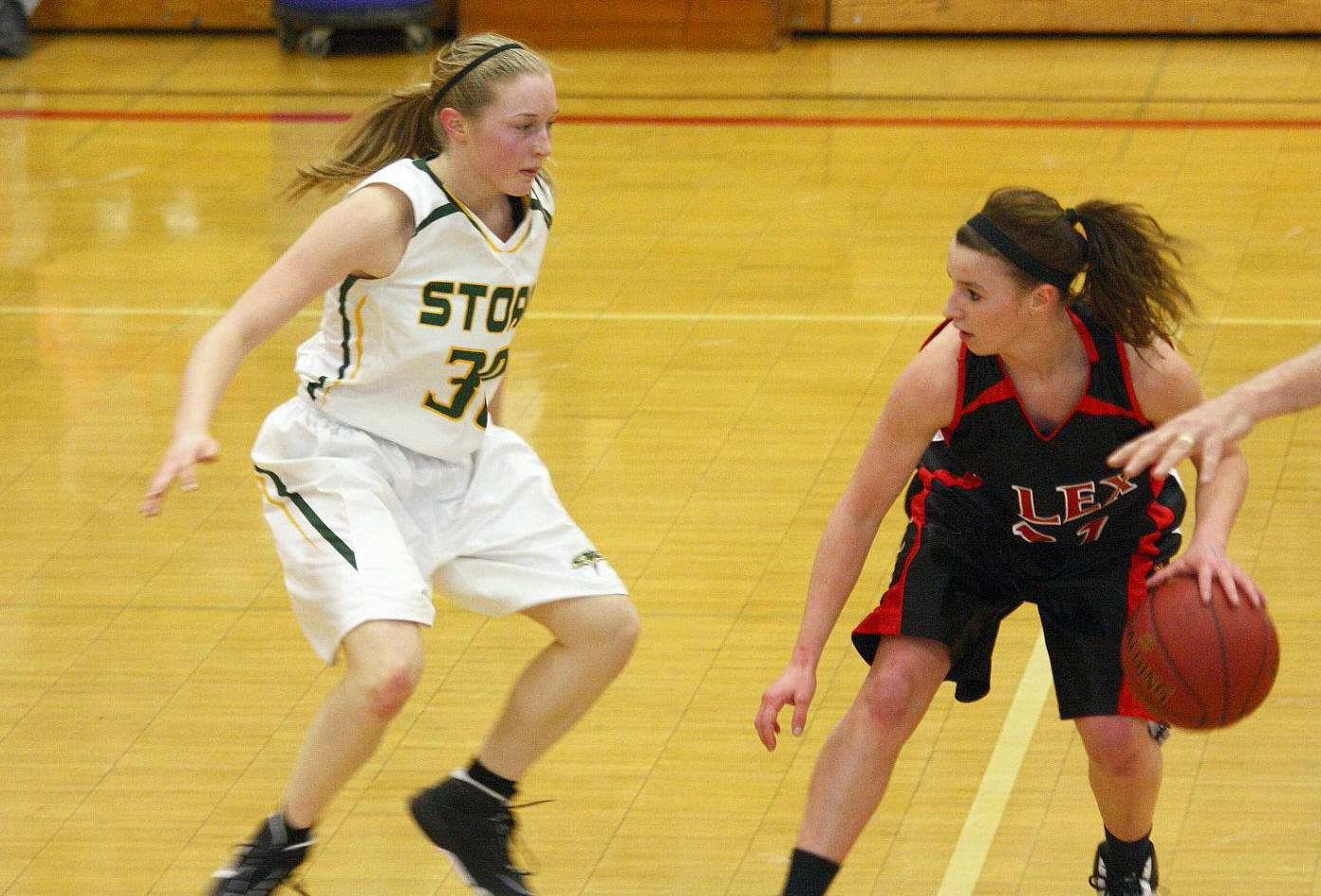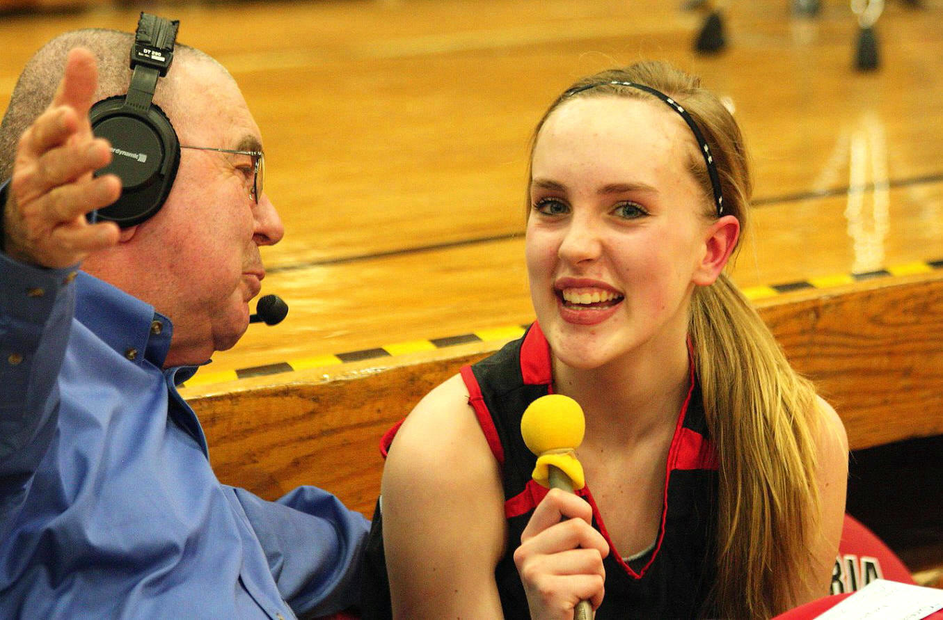 Lauren Trumm’s fan club – well, at least two of them. When young girls can have high school role models, that obviously helps establish and maintain solid programs! 🙂 This, and the following photos, are by the staff photographer of the opening section game against Sauk Rapids. As you may recall, we fans in the stands and the KXRA broadcast team could never remember a game that started 41 – 0?