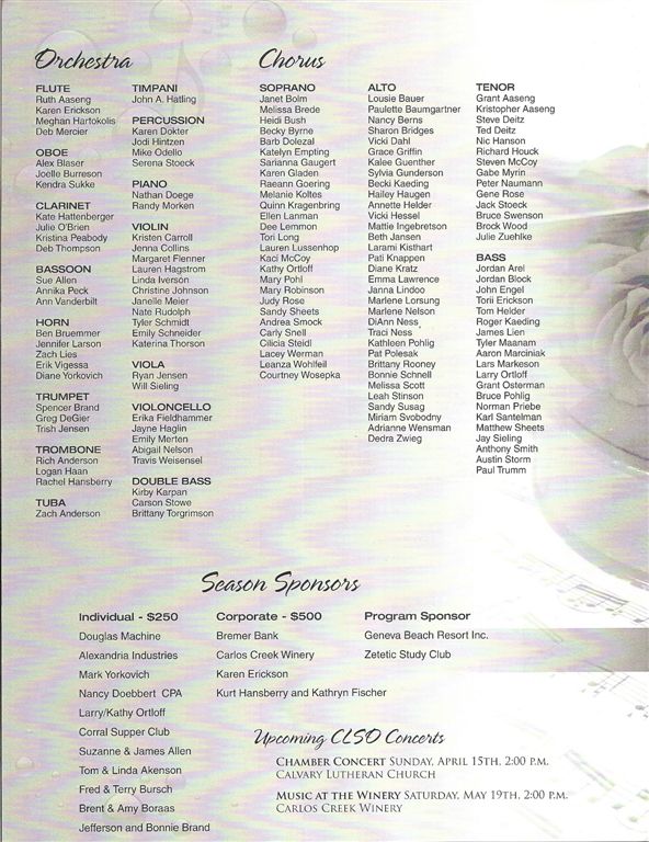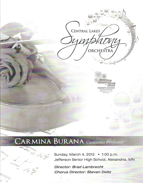 Honestly, we’ve known several 0f these people for a long time – and had absolutely no idea they were proficient in singing, in Latin! With all this local talent, makes me embarrassed to consider myself an Alexandrian. The local performers ranged in age from high schoolers to those . . . well, in the vicinity of my age! Sue Engstrom described it best: This is an amazing community. Just home from “Carmina Burana” by Central Lakes Community Orchestra and community chorus – a performance worthy of MPR!!