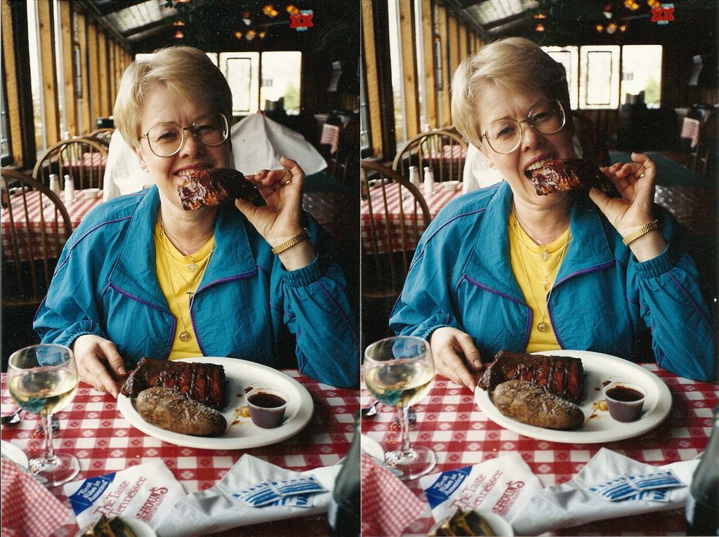 [Calhoun’s ribs in Knoxville, Tennessee, 1993. Mmmmmm! But I didn’t like “Rocky Top Tennessee” before that day. After witnessing a game in Neyland Stadium, I grew to absolutely despise it. It’s really easy to be in the band there – it’s the only song they EVER play!]