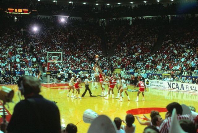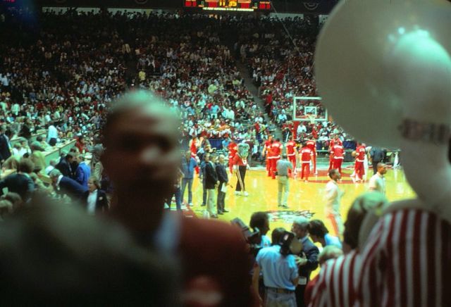 [This was the year NC State upset Houston for the championship. Jim Valvano ran around the floor looking for someone to hug. And in at least one of these photos, Akeem “The Dream” is jumping center.]