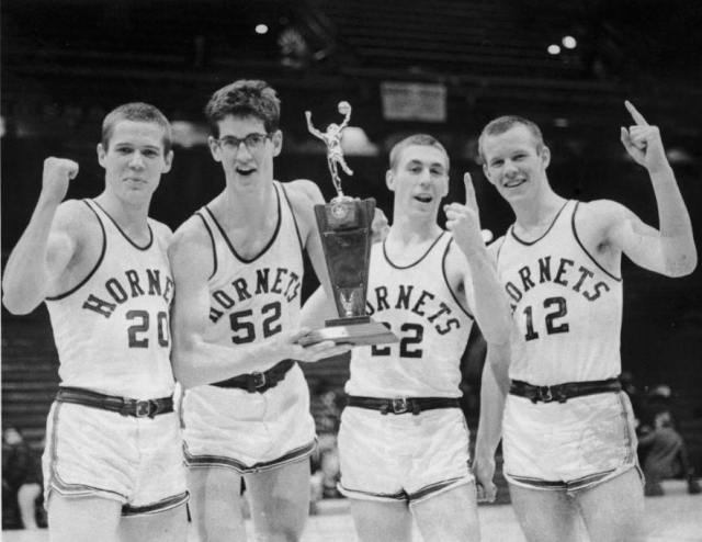 [Edina, two-time state champs in the mid-60’s led by the bespectacled 6’7″ Bob Zender. Photo from the Strib.]