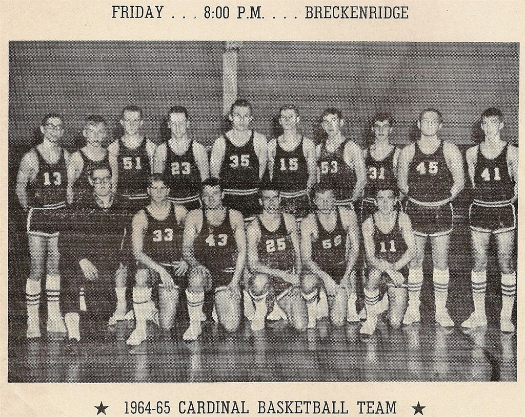 [I was neither tall nor fast, but I made up for it by being weak. And smart? We were class B intramural champs at the U of M in 1966 because I had to foresight to play with two guys who would ultimately be the starting defensive tackles for the Gophers. Jim Pahula from Buhl, on the left, and Jim Wrobel, from Browerville, next to him. I believe both those metropolises made the state basketball tournament this year.]