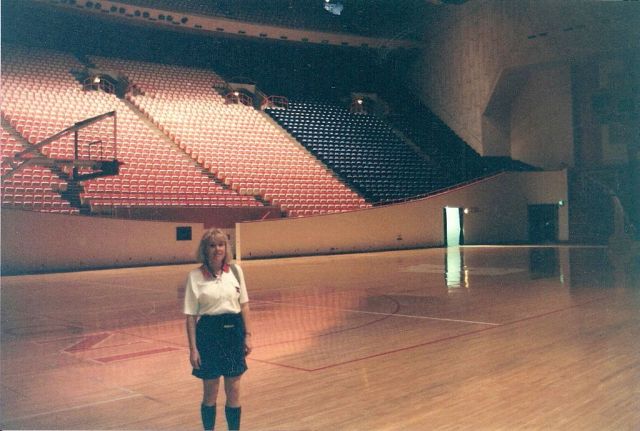 [Ruthie at her alma matter, IU, in ’91. In the mid-60’s, Ruthie never missed a game in her four years on campus, wildly cheering for Bobby Knight teams.]