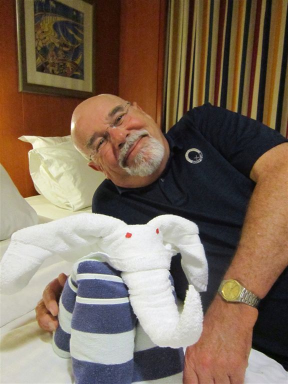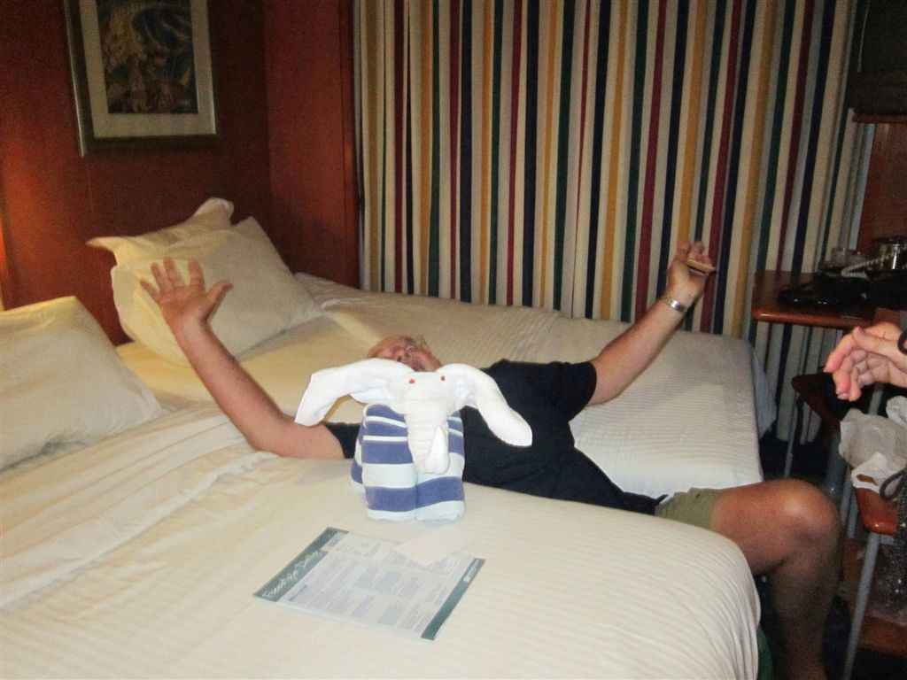 [It was my turn to model with the origami towel – the supervisor said I ruined the picture as the beds spread! 😉 ]