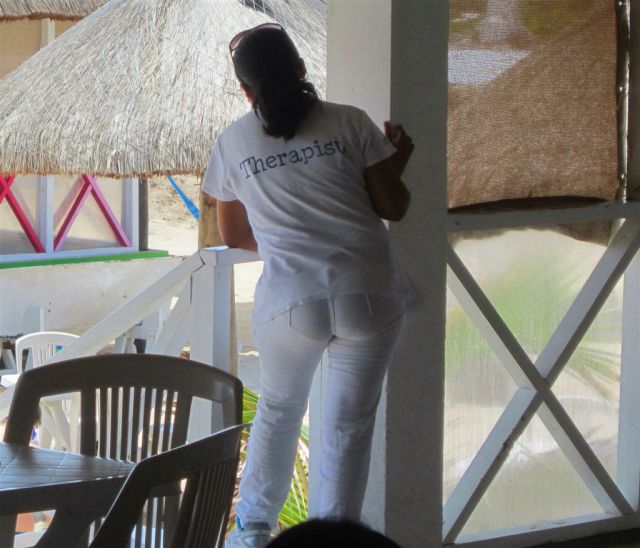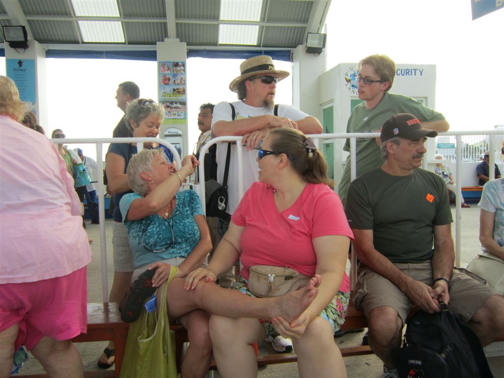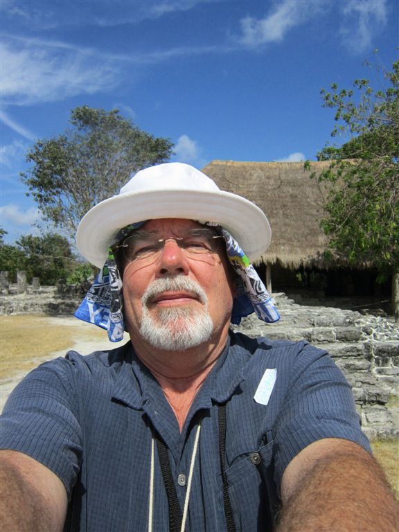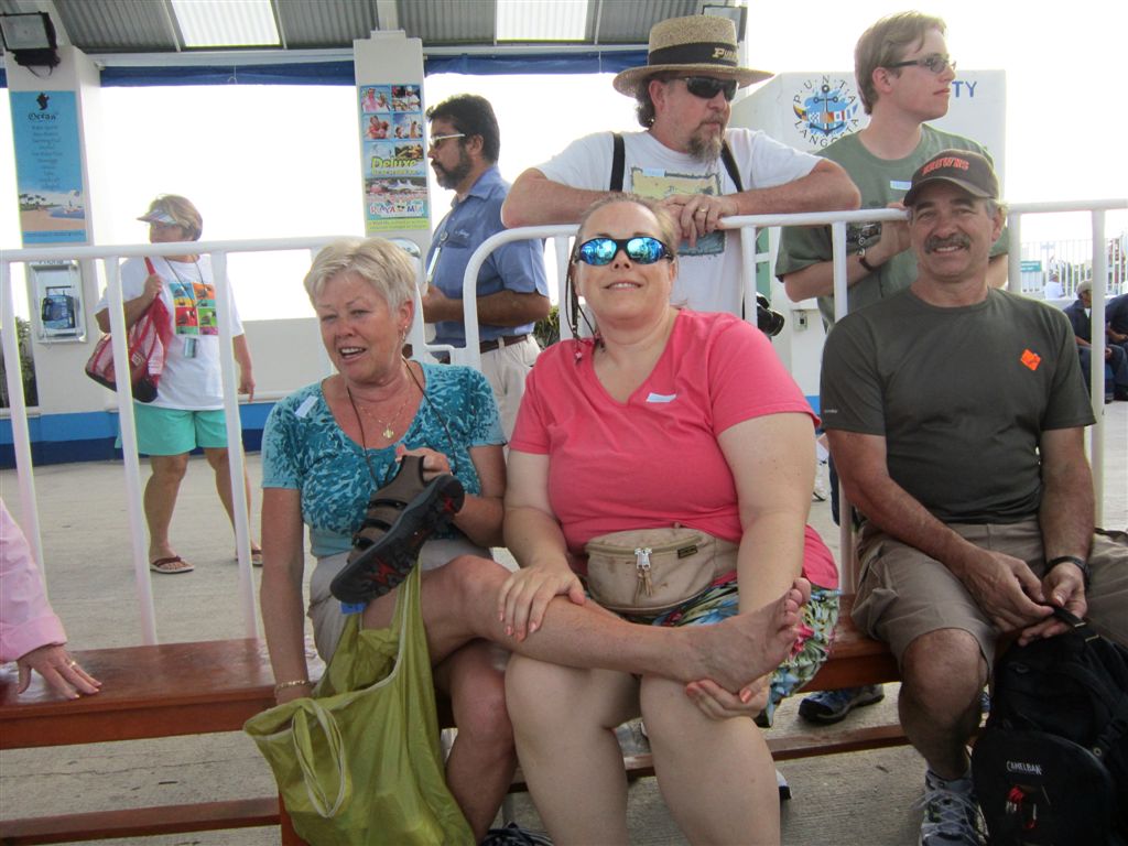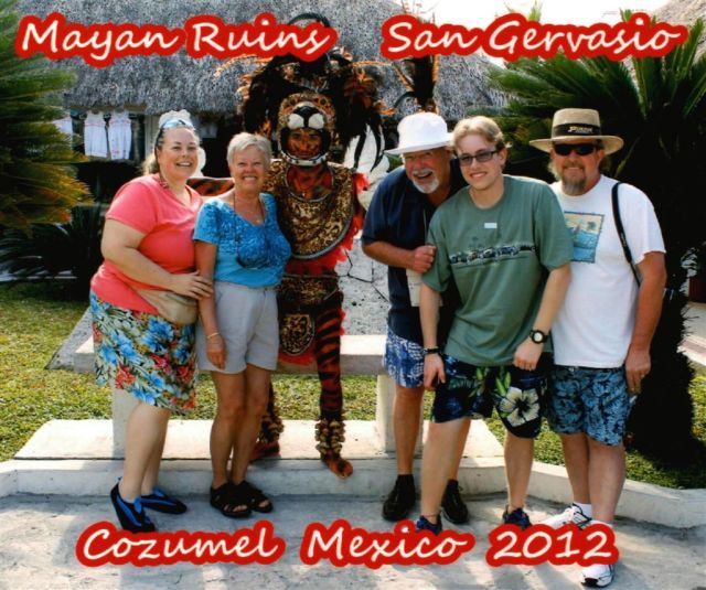 [Taking care of Mom’s bad foot as we gathered for our tour of Mayan ruins at San Gervasio. Do not know the Corey Pavin look-a-like on the right.]