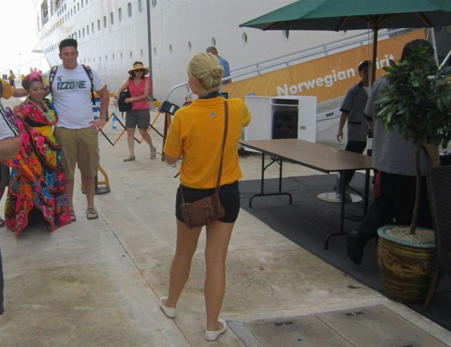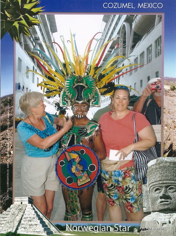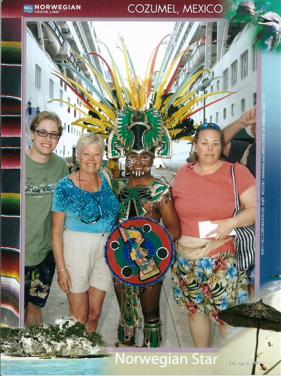 Last stop – Cozumel. Probably the most well-known stop on the trip. In this part of the Caribbean, Cancun is probably the biggest tourist destination – with Cozumel right behind. The supervisor had issues with our debarkation photo (above). Because I have this habit of “shooting the shooter,” I was cropped out of the family photo as someone obviously not part of the party at issue! The supervisor raised a stink, so I believe the one below was included at no additional charge. And that one included a little more of me – but cropped out Tom! Uffda!