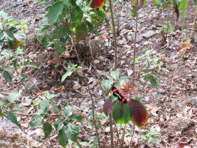 [Just to the right and south of center, a striking black and red butterfly. There were several around these plants.]