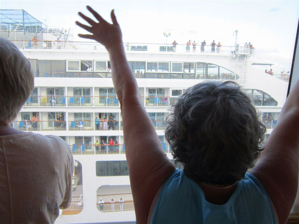 [Possibly my favorite photo of the whole trip – Rita waving good-bye to our fellow Norwegian cruise liner.]