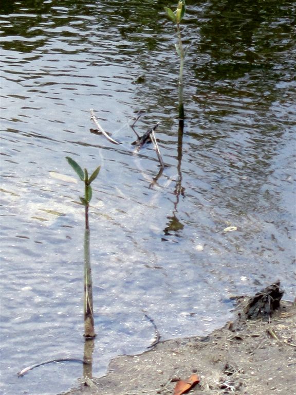 [Young mangrove trees – their seed pods (like a large green bean) float around until their GPS system says this is a good spot, then they tip and take root.]