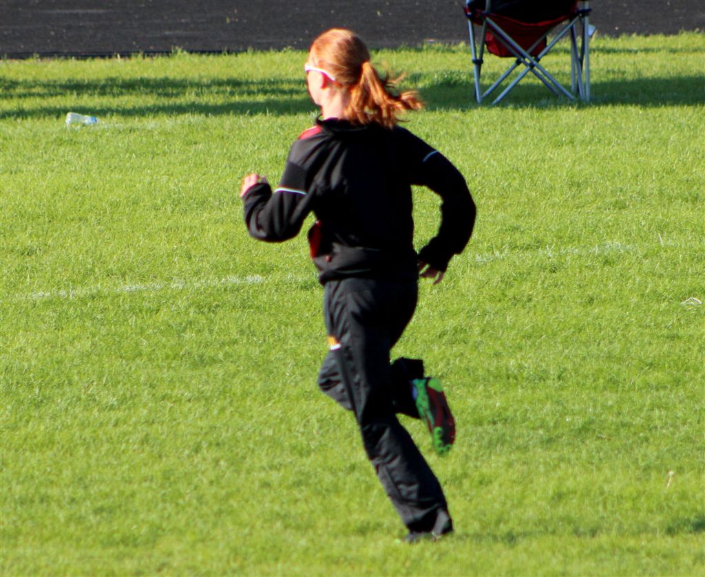 [My last event was the girls 3,200. I decided I couldn’t hang in there for the girls 4 x 400, the final race of the meet, without a large injection of caffeine. But I got to see Megan Hasz, above. Megan won her event handily – as did her twin sister, Bethany, in the 1,600 earlier. And like the aforementioned Ms. Johnson, they are also only 8th-graders! 😮 ]