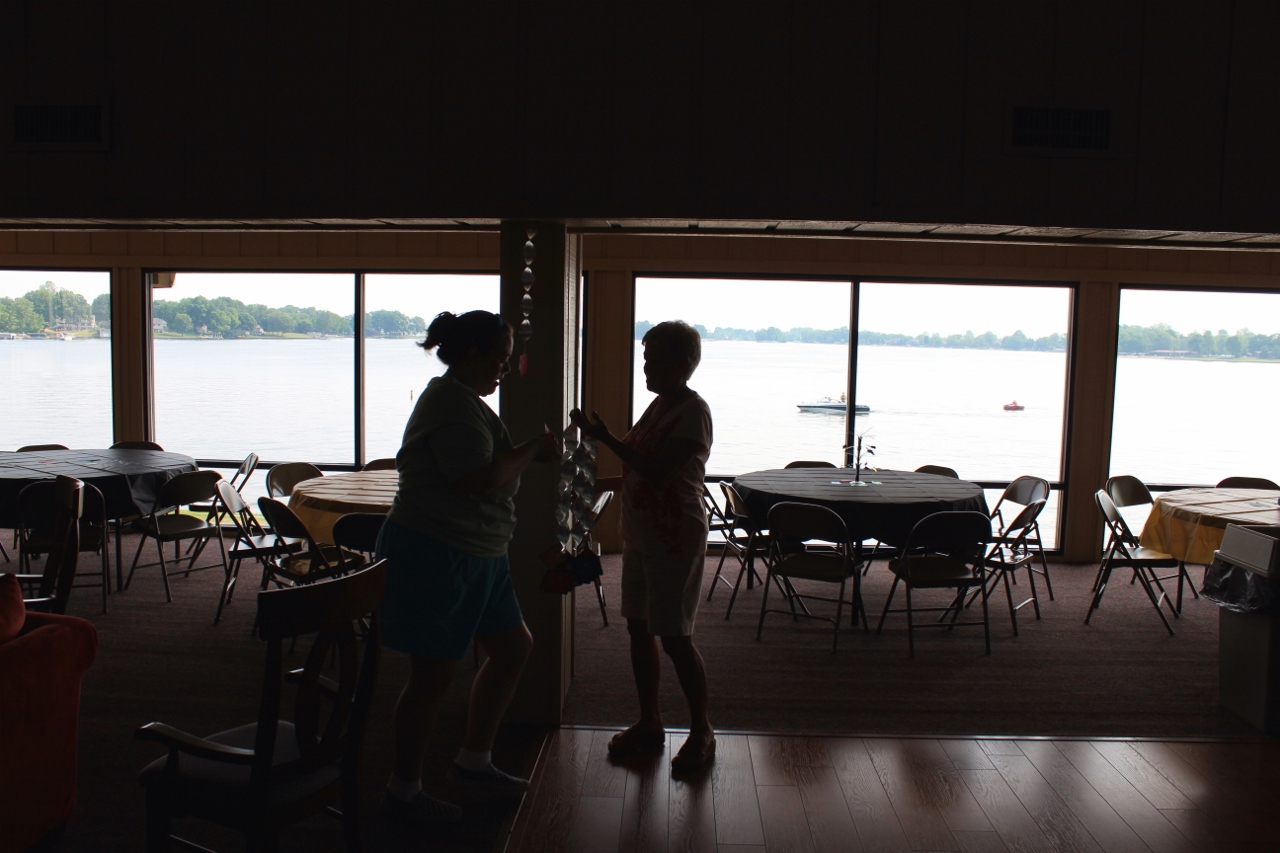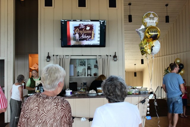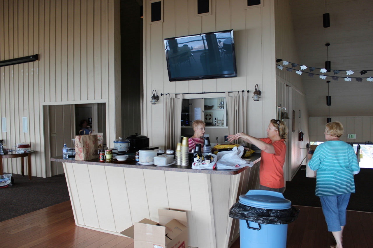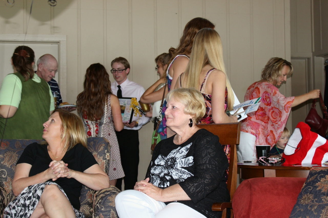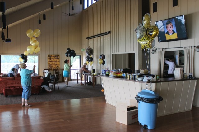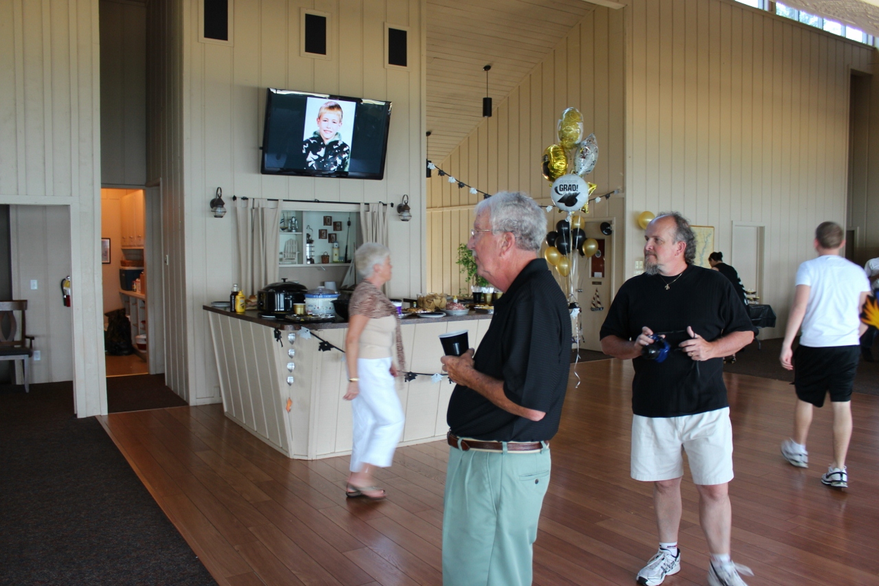 [Grandma, mom, and grandma supervising the balloons. Tom’s slideshow on the big screen.]