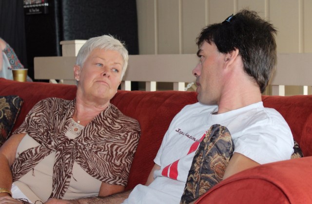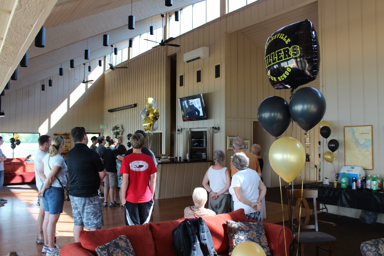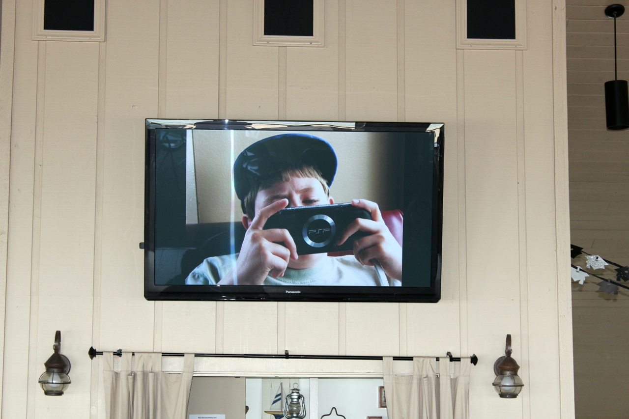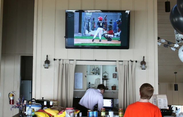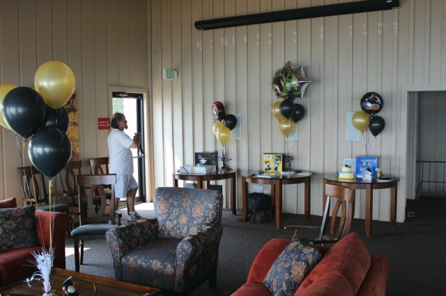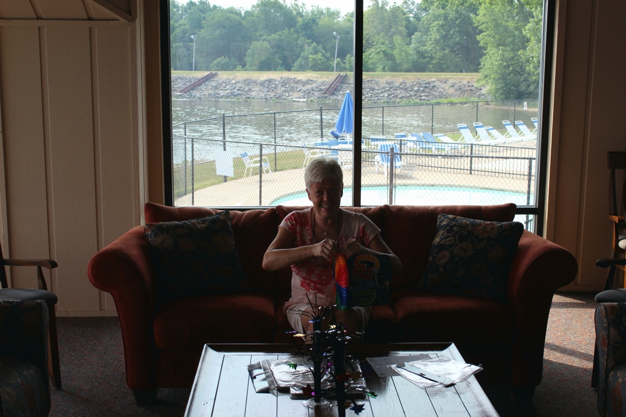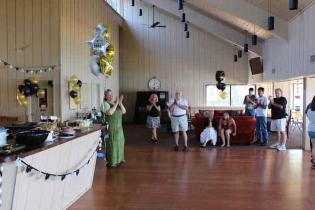 [Grandma, mom, and grandma supervising the balloons. Tom’s slideshow on the big screen.]